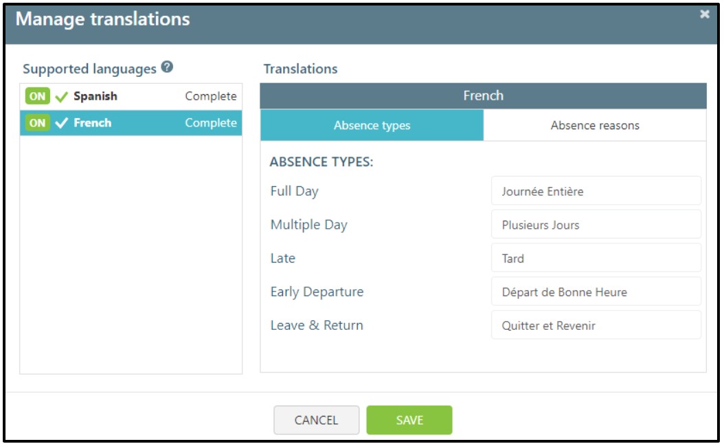 Support can also enable a Google Translate dropdown for Web Links so that when a user clicks a web link to explain an absence, they will be able to use Google Translate to translate the page into any language that Google Translate supports. Please note that if you have already set up your own translations for Spanish and/or French, your own translations will be used in place of Google’s.