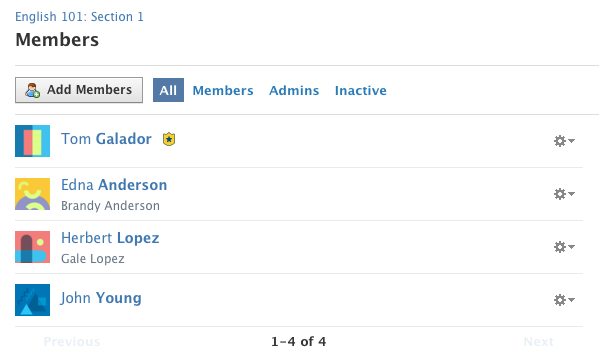 For example, if this is enabled for the Instructor role at your school, Instructors who are Course Admins will see parent/child associations in the Members list: