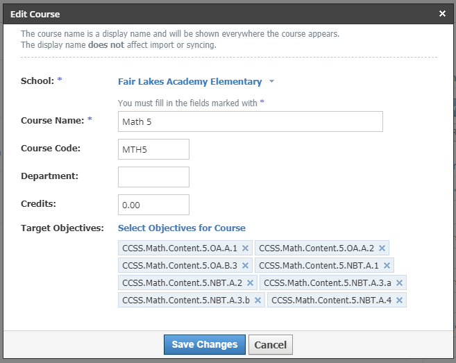 After a System Administrator has enabled the Course Learning Objective permission in an environment, educators tasked with aligning curriculum to objectives can add learning objectives to courses in a school.