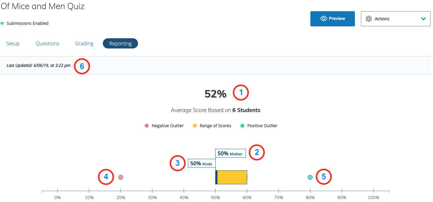 You can also gain insights into the distribution of answers and analyze metrics per item such as average score and points. Data is reported in real-time from applicable grade settings for assessments that have multiple choice or true/false answers and displays the scores that count in the final grade. Any override scores submitted are also captured in the overall graphs in the Reporting area, but override scores are not currently captured in the View All Students details.