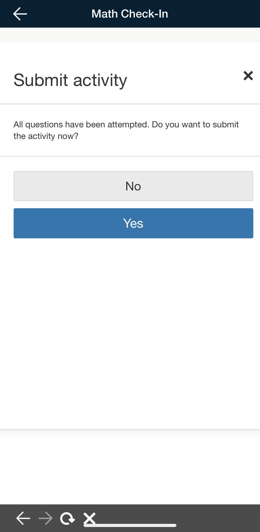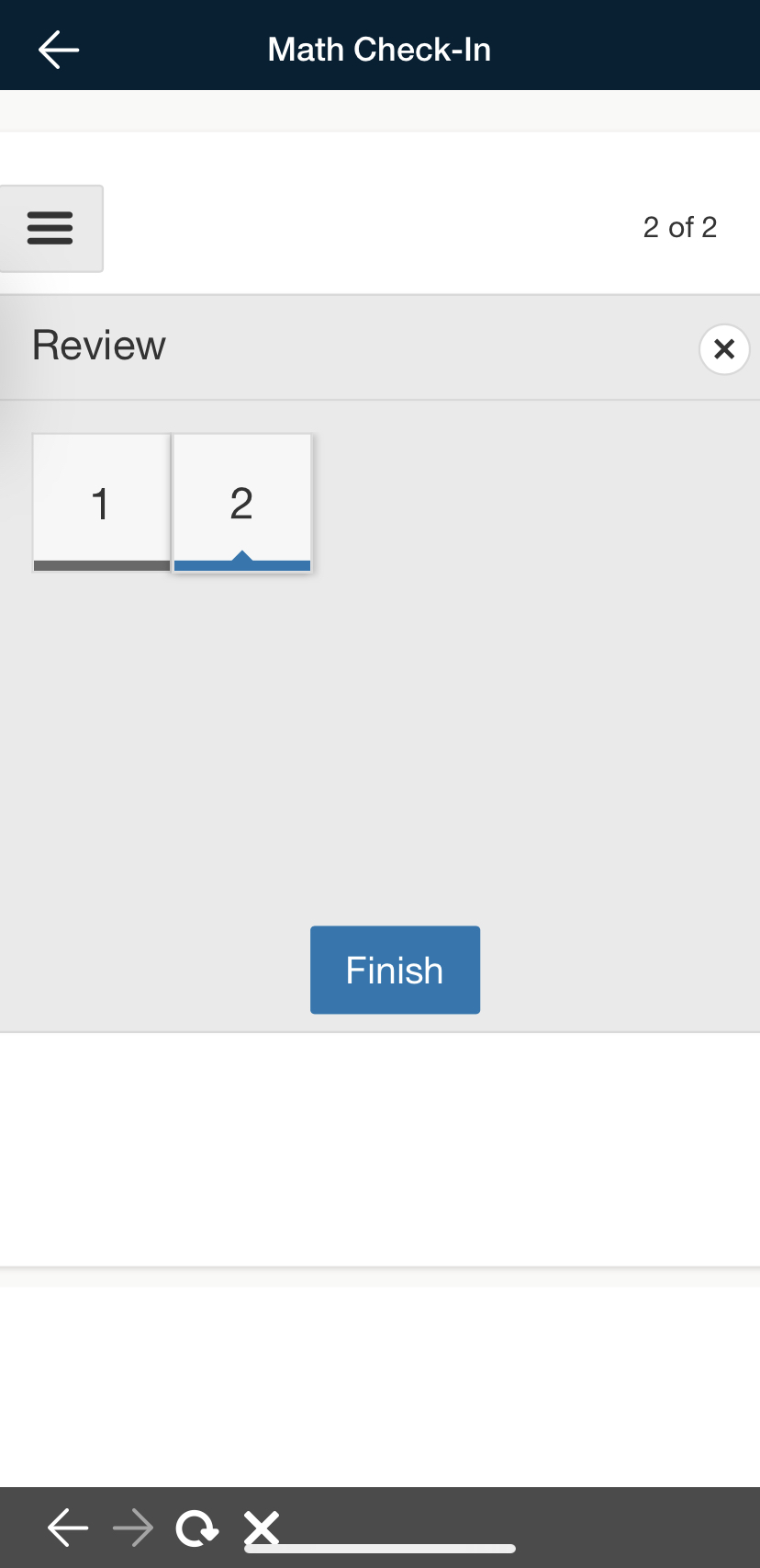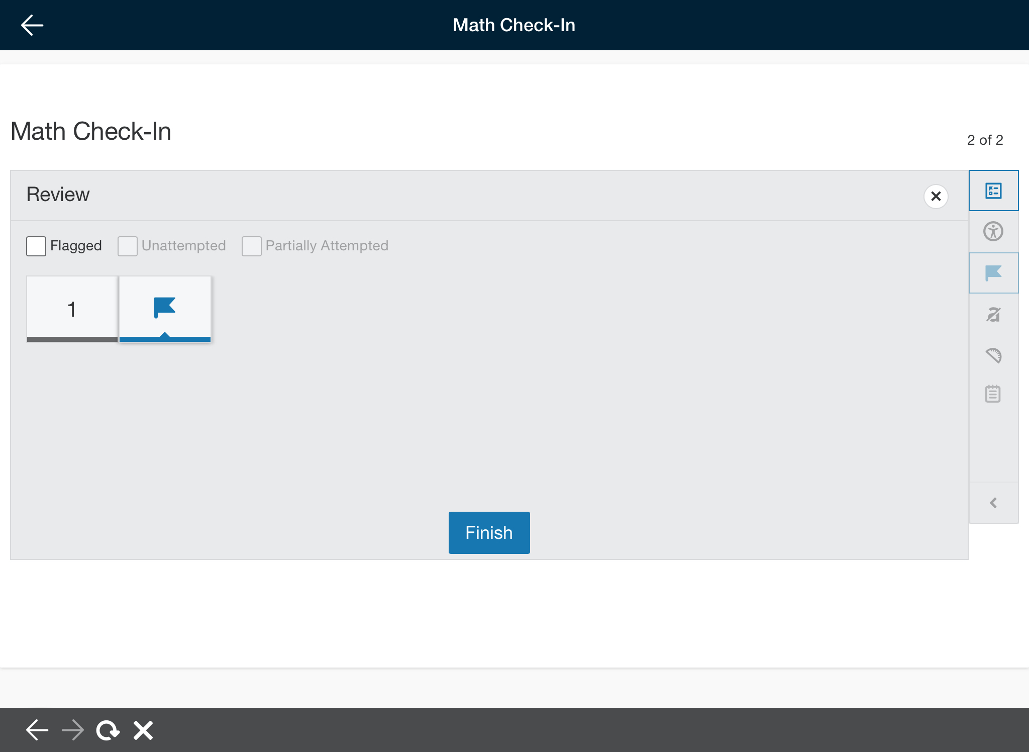 After answering all questions and using any necessary tools, you can submit the assessment by tapping Finish on the review screen and Yes on the next screen. Tap No to continue a review of the attempt.