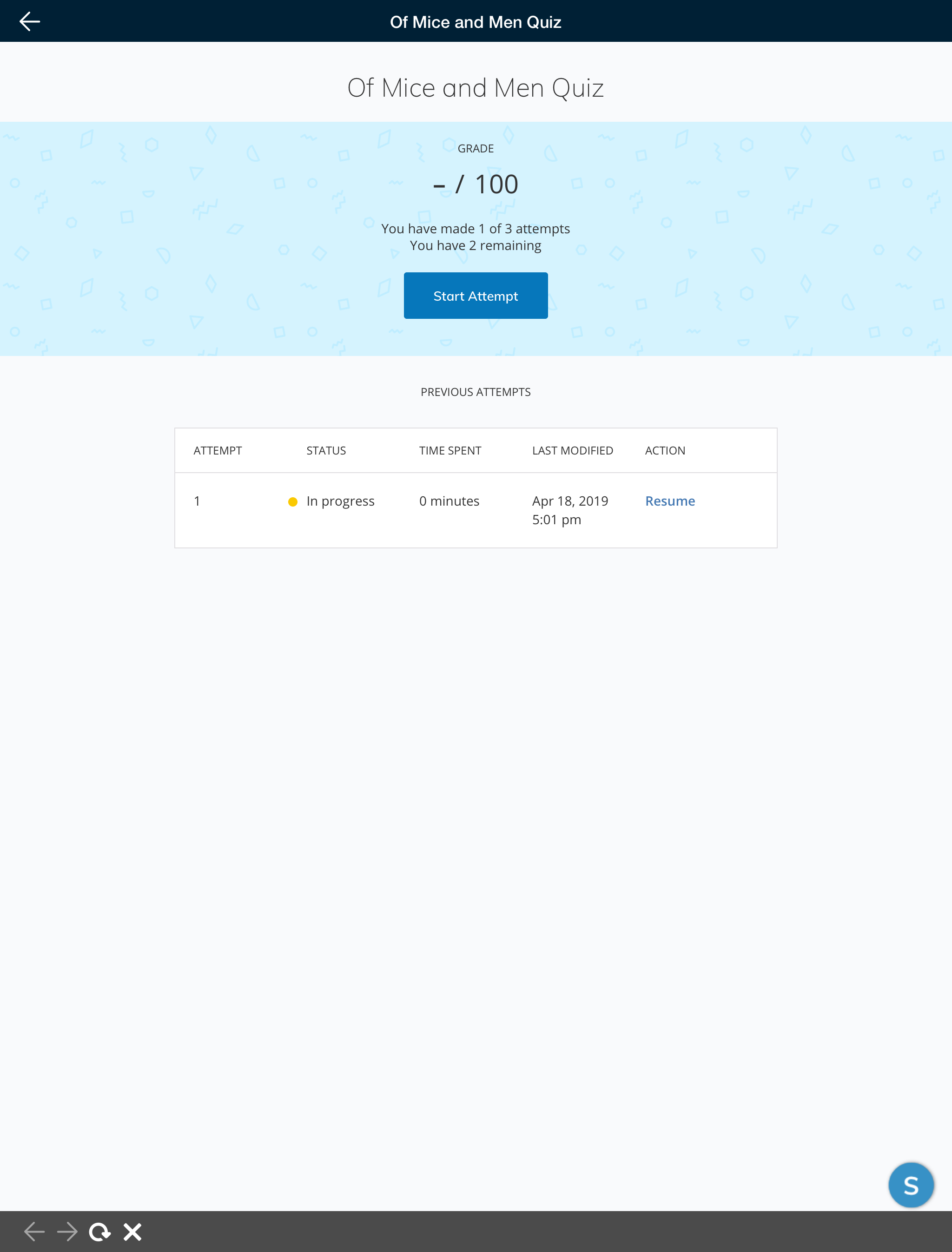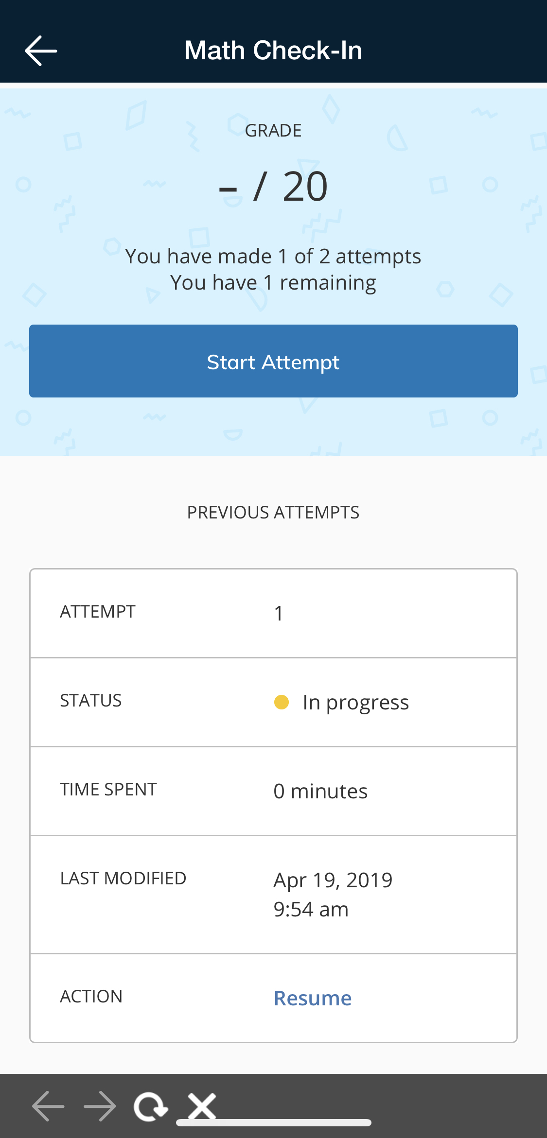 Tap the assessment or managed assessment to open the assessment directly within the iOS app. From here, you can start a new attempt or resume an attempt you have already started.