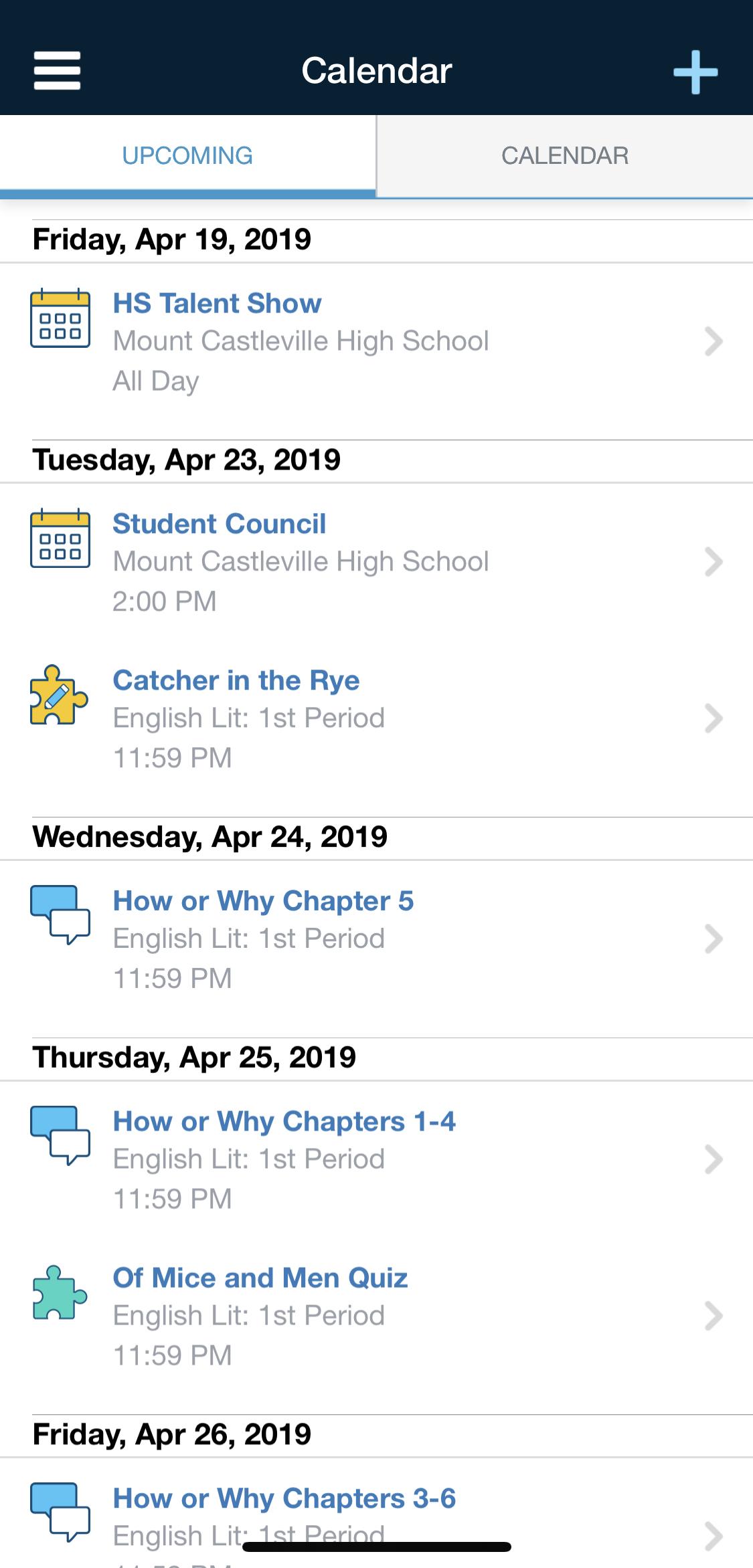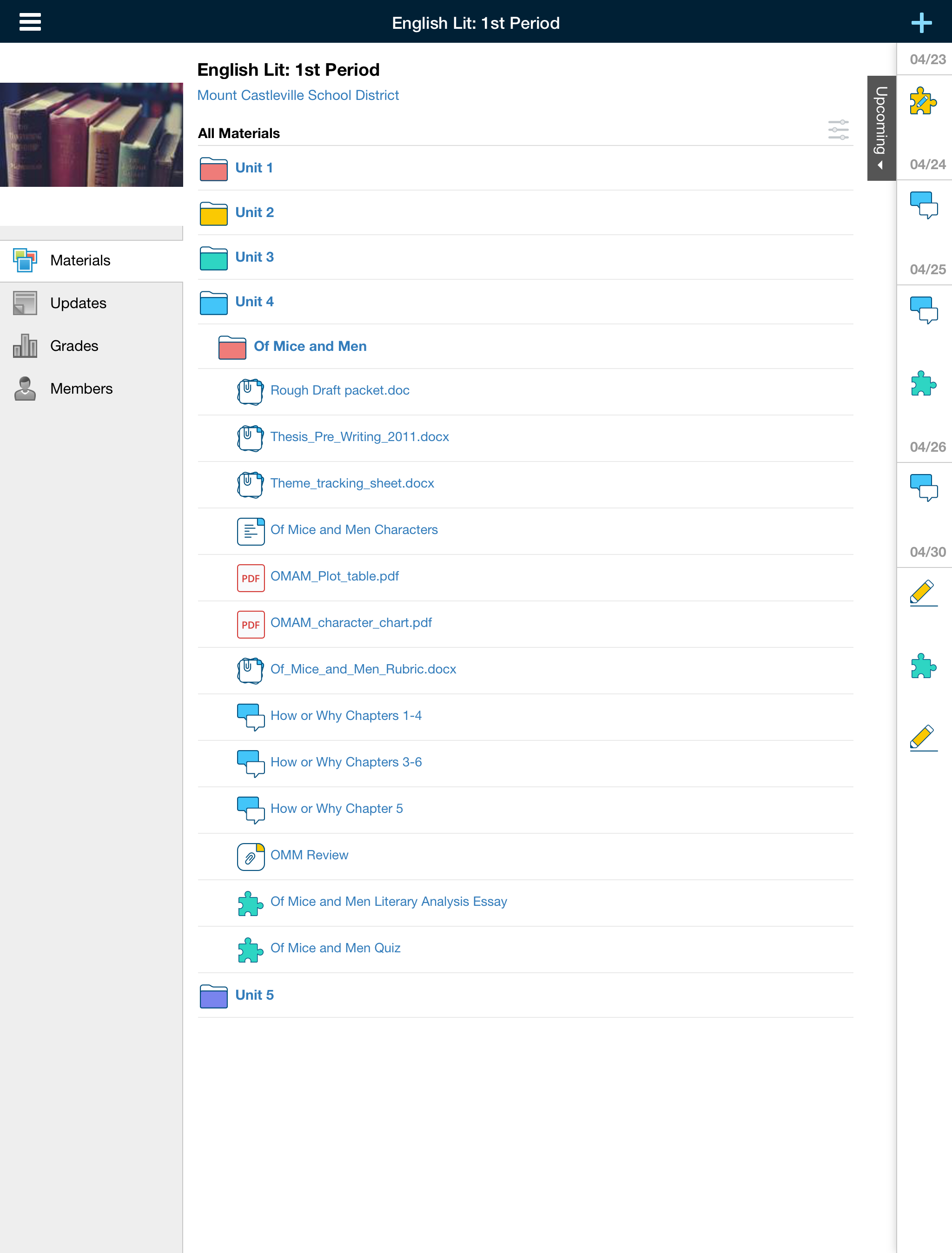 Above, the Course Materials view, and the Home screen with the Upcoming Calendar view on an iPhone X. Below, the Course Materials view, and the Home screen with the Upcoming Calendar view on an iPad Pro.