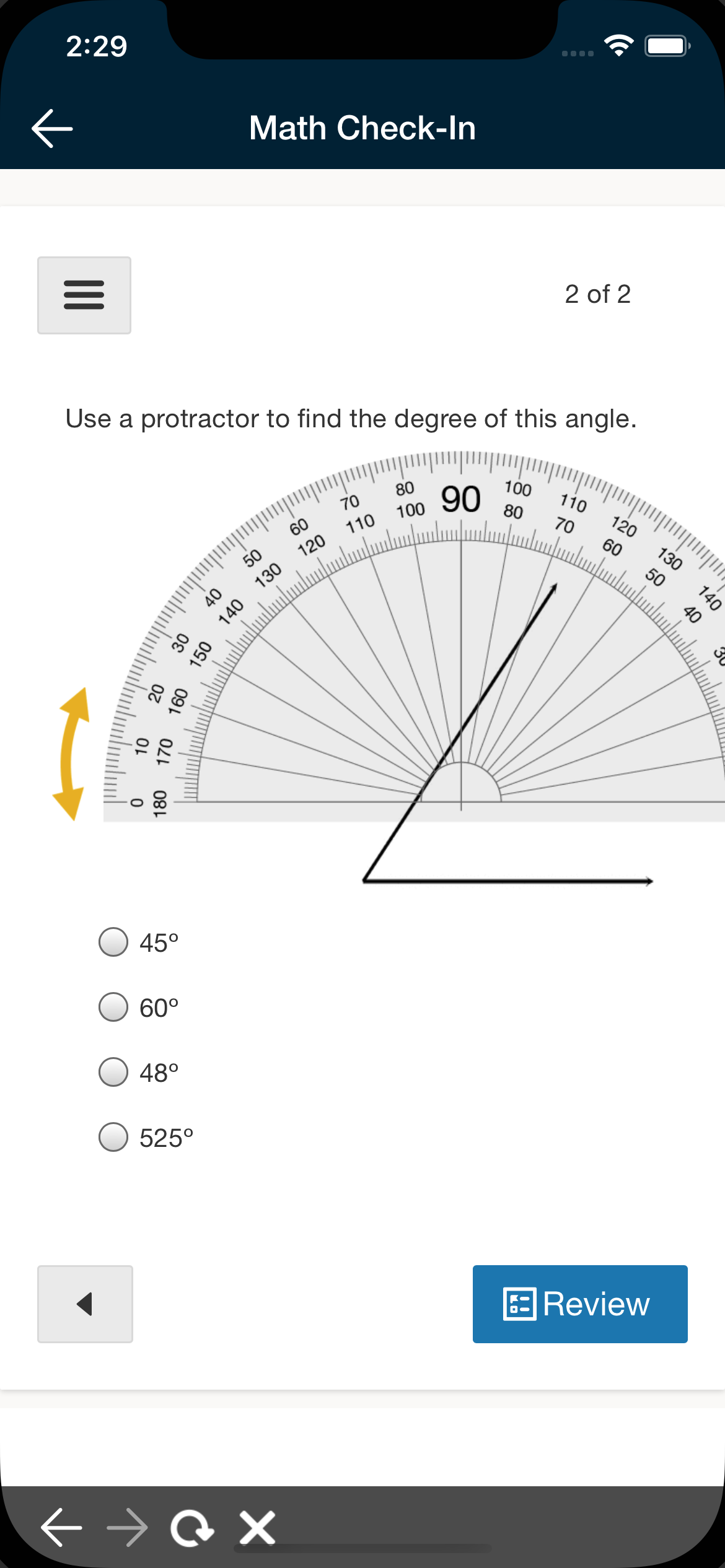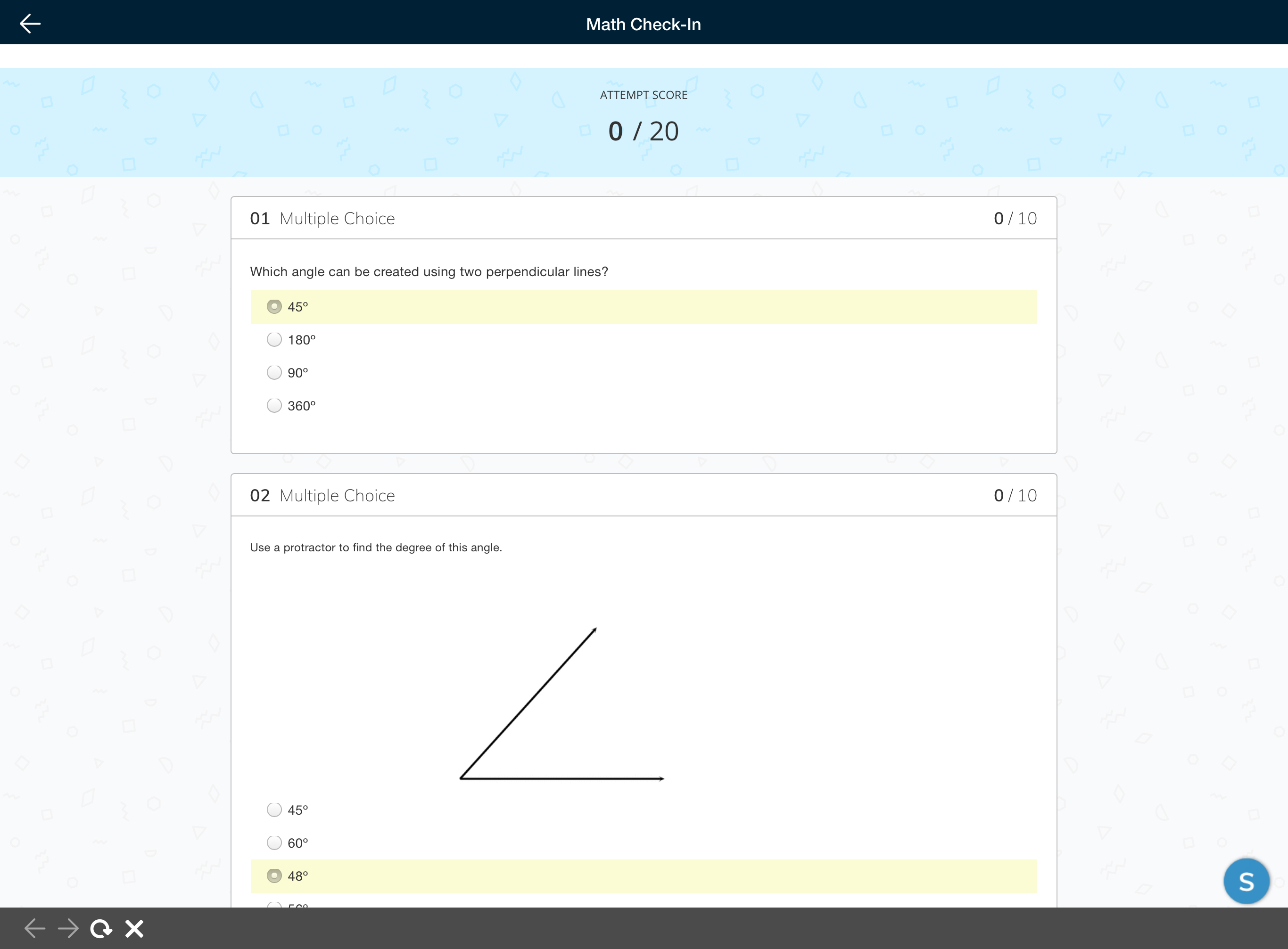 The assessment experience has been optimized for small screen sizes, so you'll notice some small changes when taking an assessment on a smartphone. The toolbar is collapsed into a drop-down menu and the arrows on the bottom are used to navigate between questions.