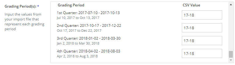 On the import file setup page, the Grading Periods field displays a list of the Grading Periods you've created in Schoology on the left. On the right, type the value used in your import file to denote each grading period. For example, if your import lists each course section as using the year-long 2017-2018 period like the following example: