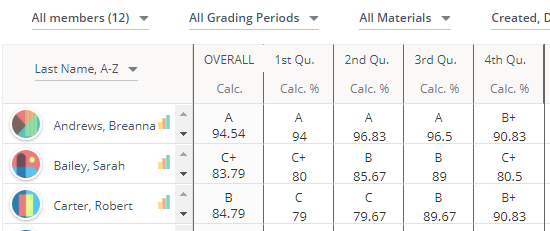 In the course gradebook, grades for each quarter period are averaged to calculate the Overall course grade, which represents the grade for each student over the entire 17-18 year.