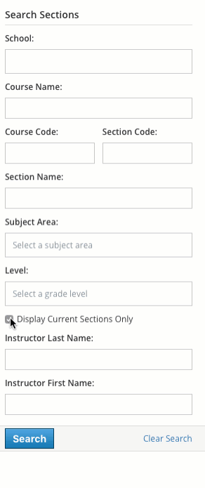 Display Current Sections Only: Checked by default, this setting limits the search to current course sections based on the current grading period. Unchecking this box will include archived course sections in your search and enable you to search by Grading Period.