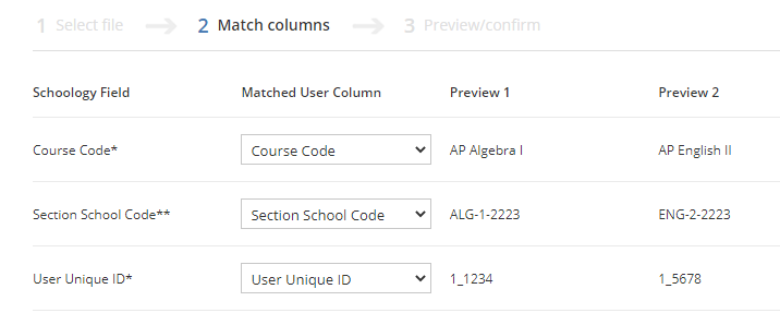 Match the information from a Schoology Field to each column in the spreadsheet to provision users into course sections in Schoology.