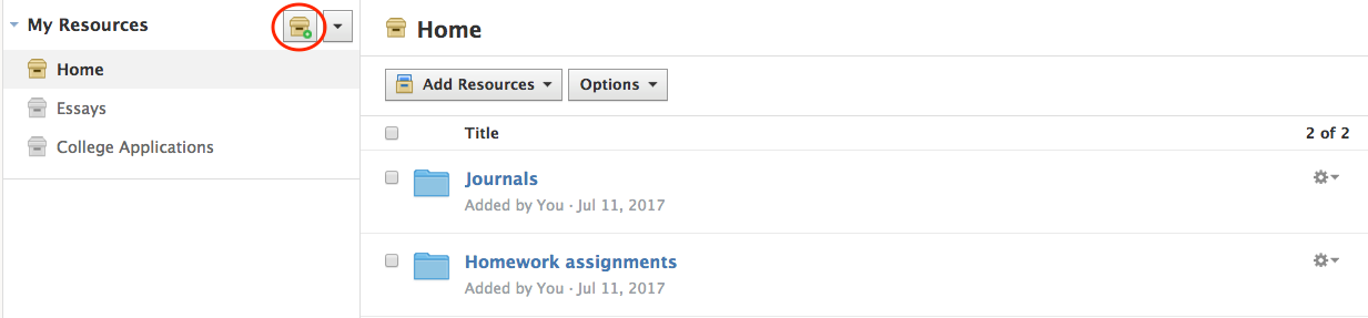 My Resourcesis your own personal library of documents that you create in Schoology or download from other sites. It's easy to organize, create, and copy/move your resources right from theMy Resourcespage. Saving your documents in this personal library enables you to access them for years to come and use them in any courses you take in the future.