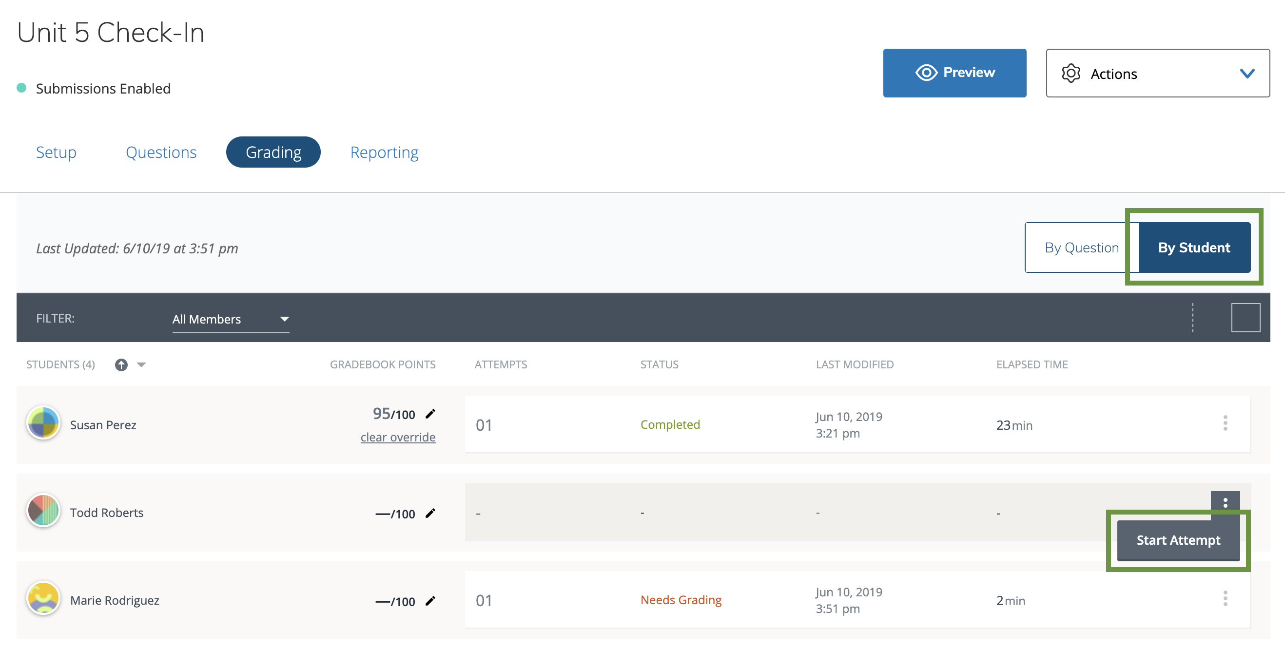 1. Click Start Attempt in the overflow menu of the student’s empty row.