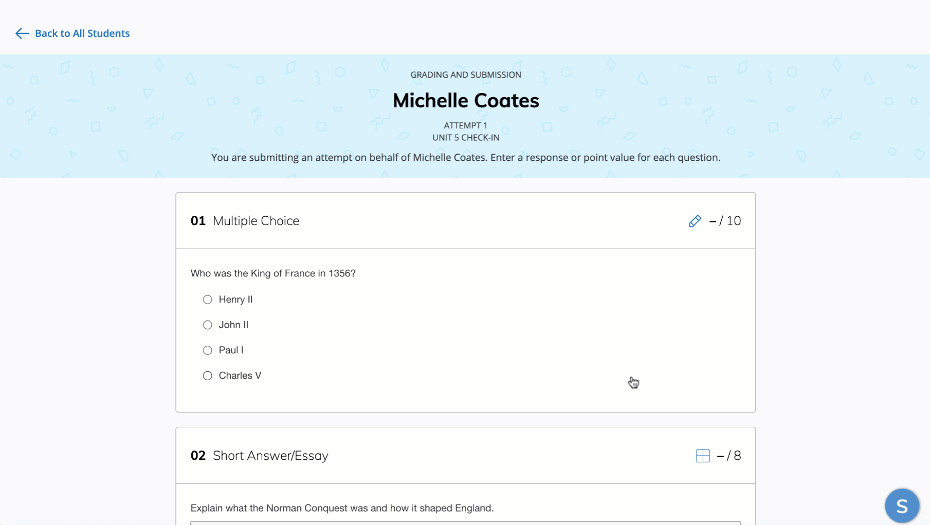 2. This launches a new attempt in which you can enter the specific responses for each question. For Course Assessments, you can enter the points awarded for each question.