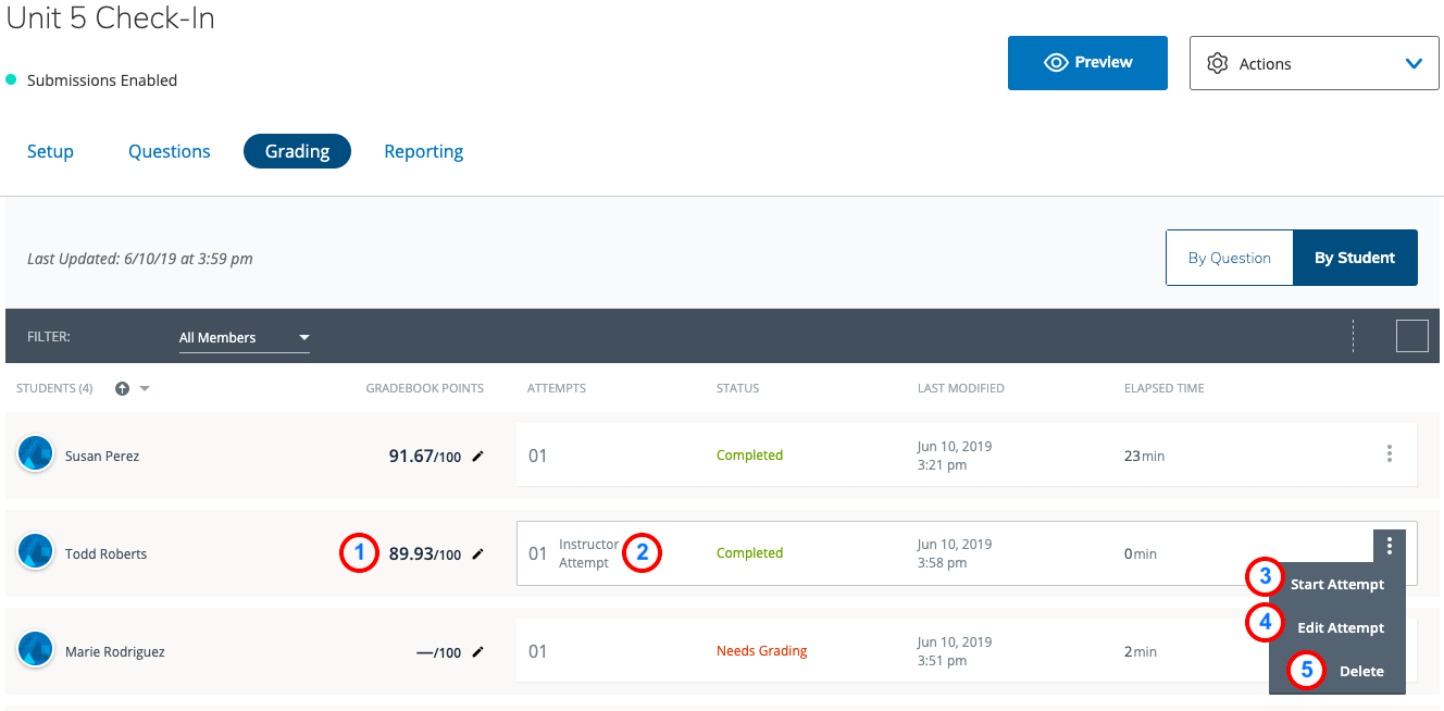 Attempts submitted via this workflow are noted by Instructor Attempt in the Attempts column.
