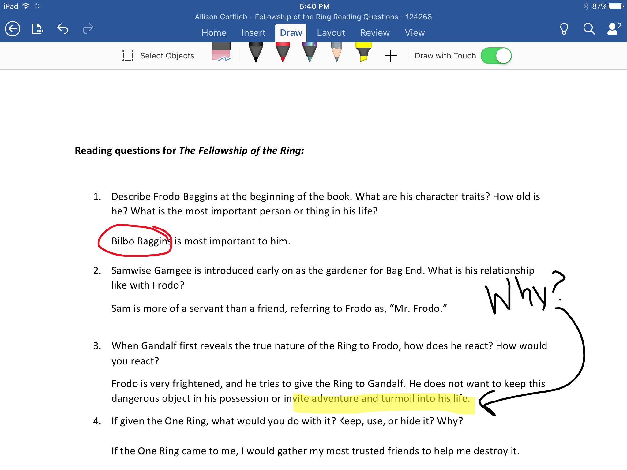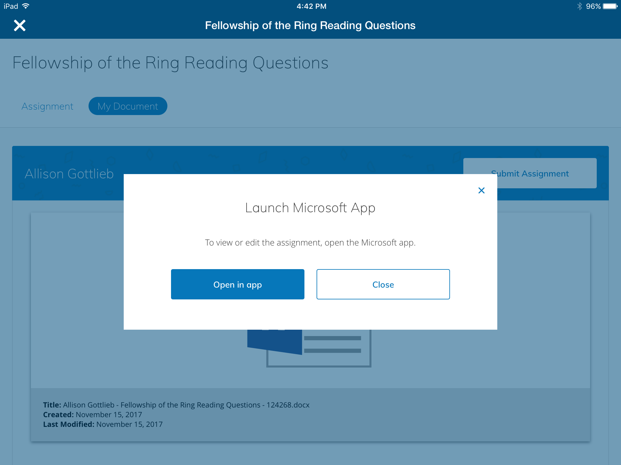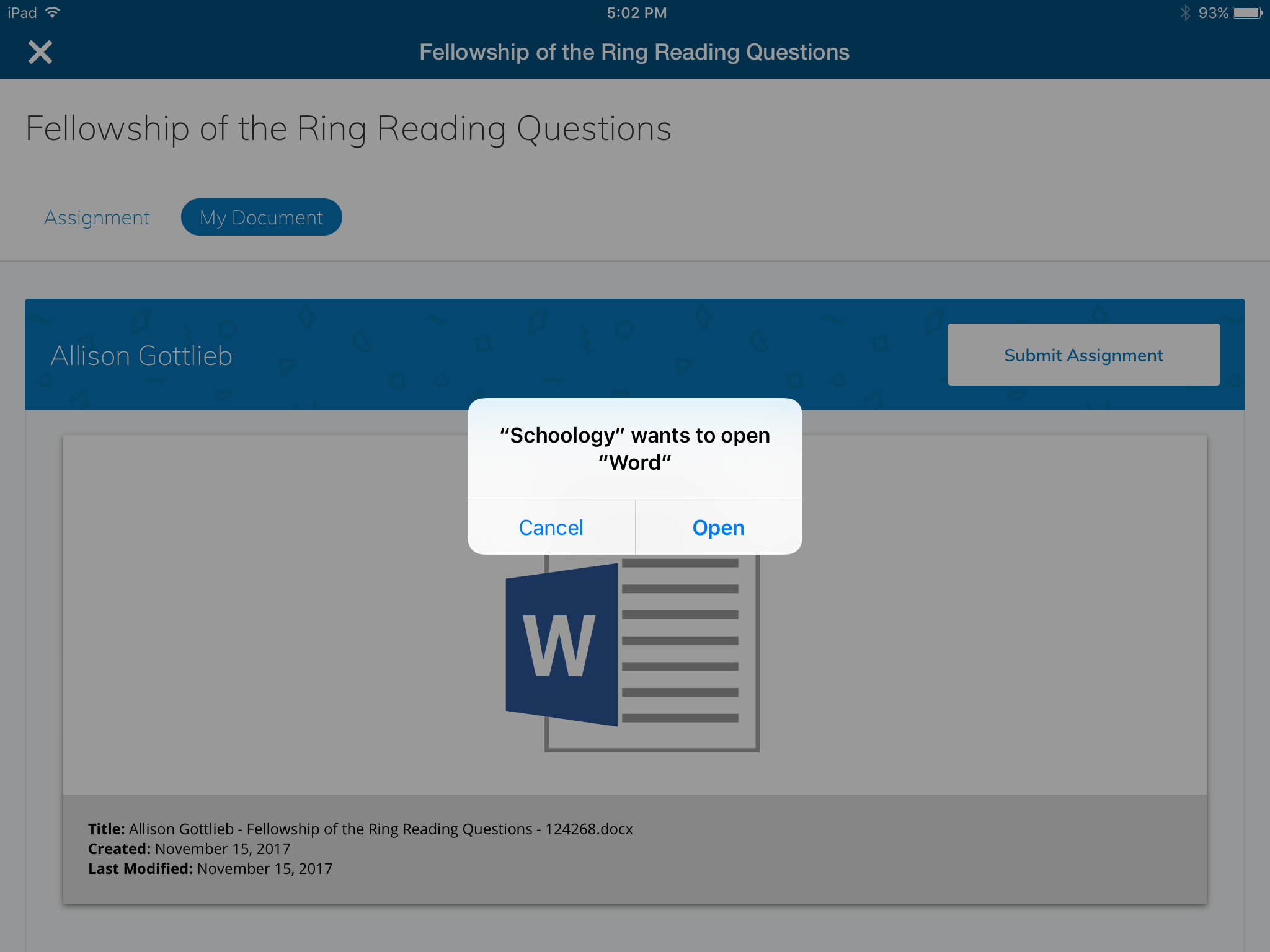 This launches the file in the respective Microsoft application. In the next example, the assignment contains a .docx file, tap Open to launch the Word app on a tablet:
