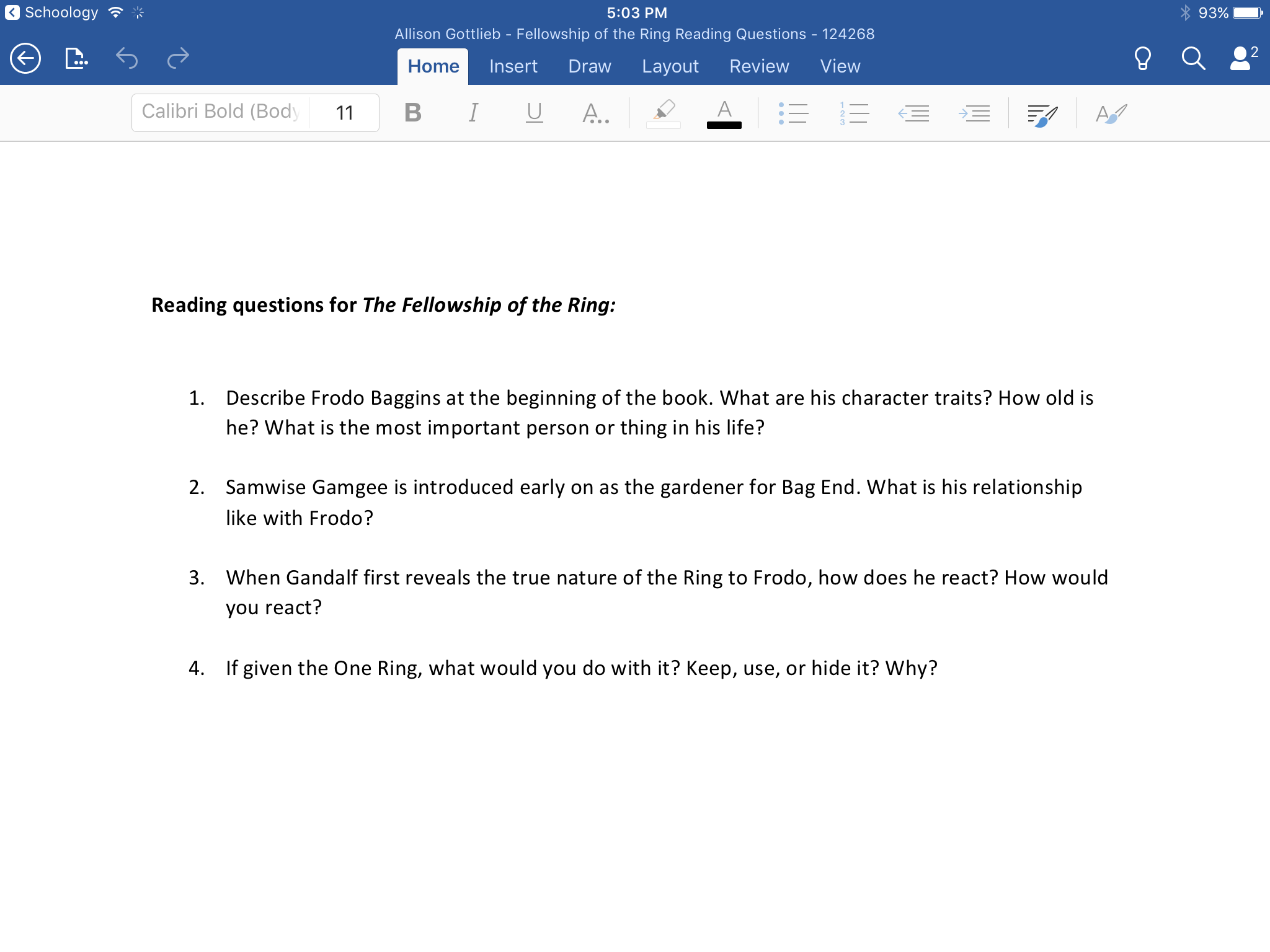 Your file will launch in the Word app, where you can view and edit your copy of the assignment file. When you are done working and saved your work in Word, tap Schoology in the upper-left corner of the screen to return to the Schoology app.