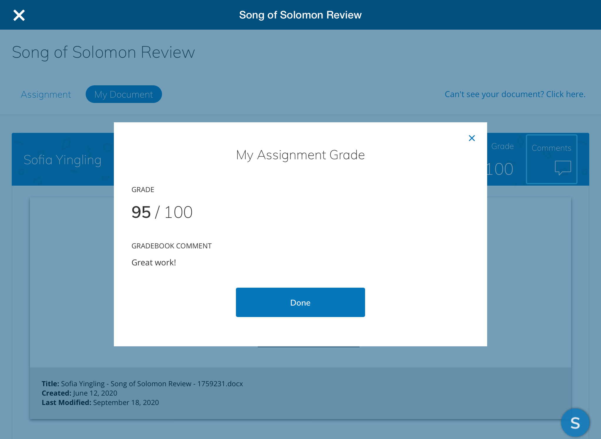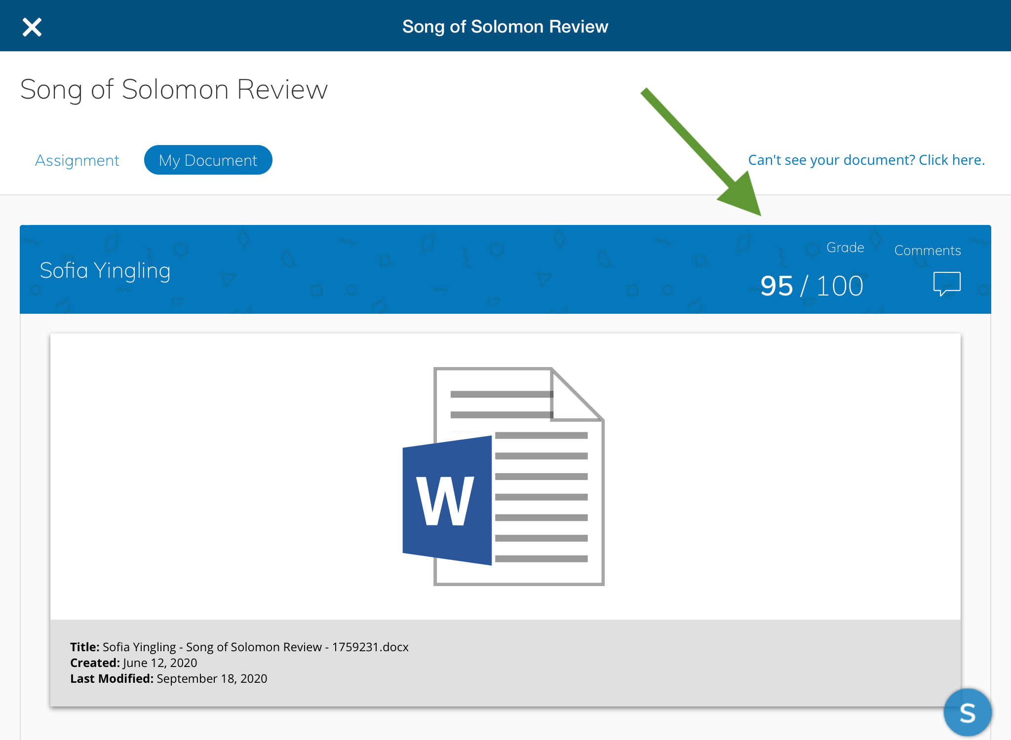 View grades for your OneDrive assignment from the My Document area: