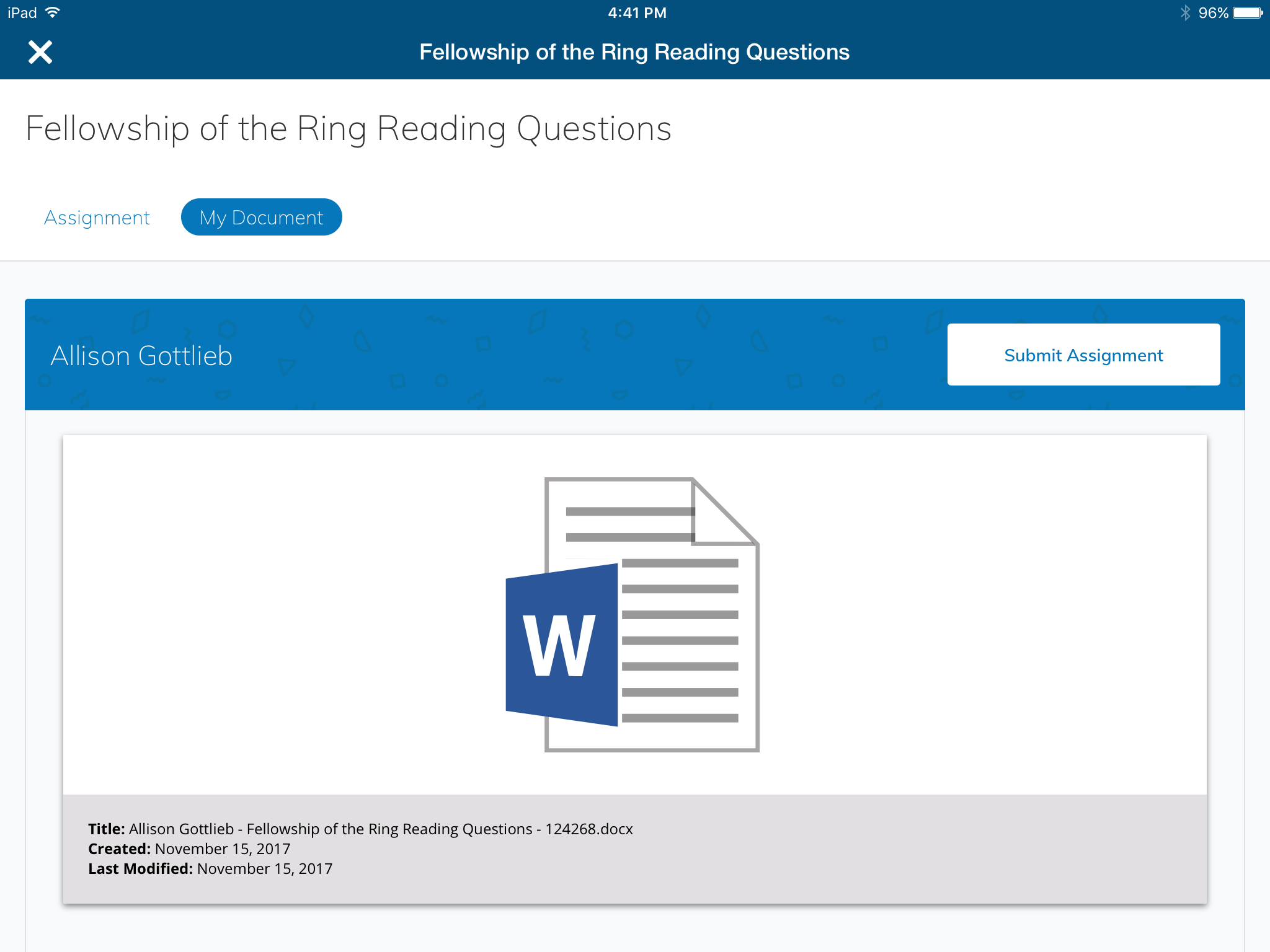 Tap My Document to create your own copy of the original file your instructor attached to the assignment. This copy will then be shared between you and your instructor. The file will also be placed and organized in your OneDrive.