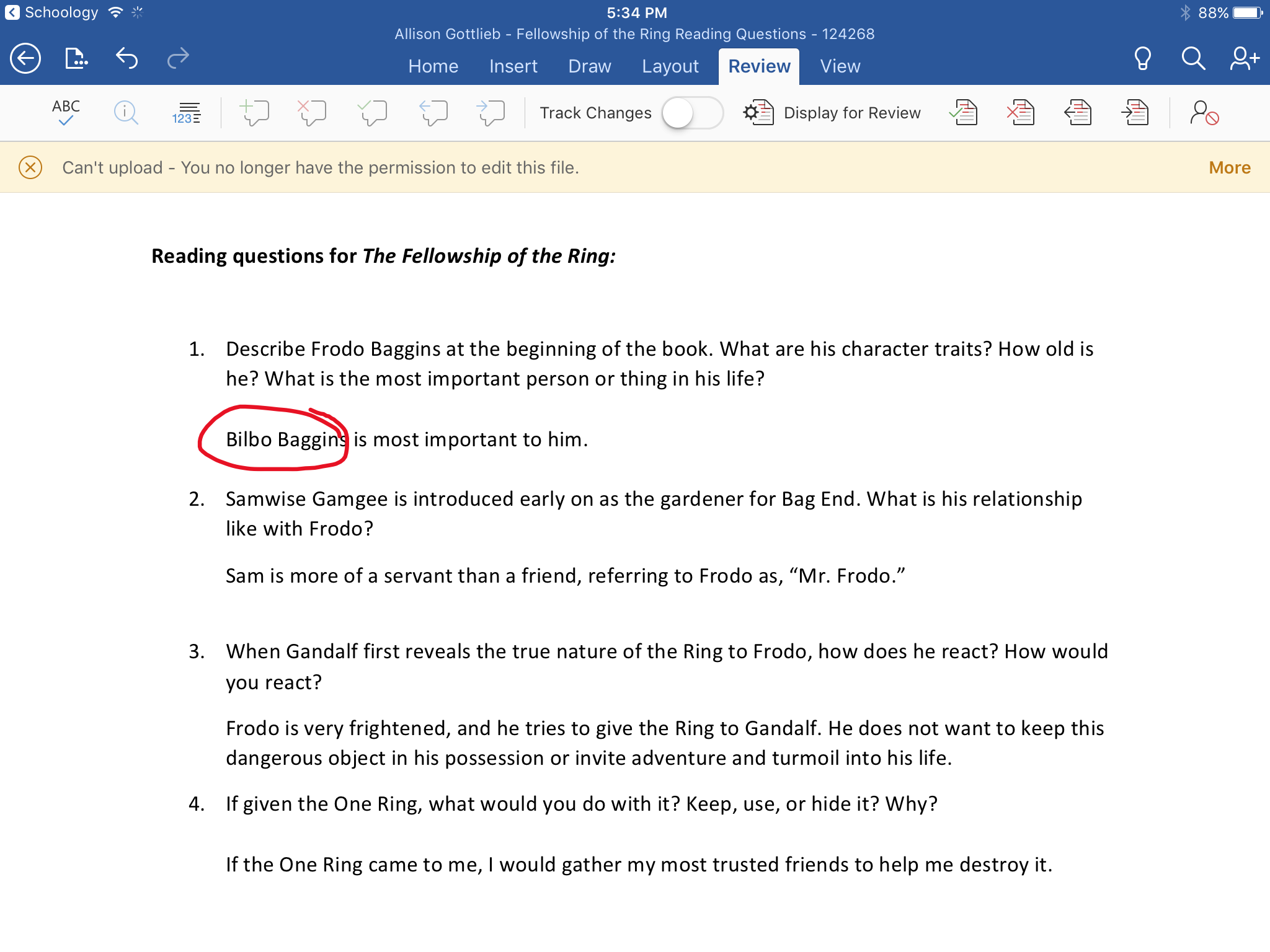 Back in the Schoology app, tap Submit to submit the Word file to your instructor. Once you submit, you no longer have access to edit the file. If you navigate back to the Word app to edit the file, a warning message will appear: