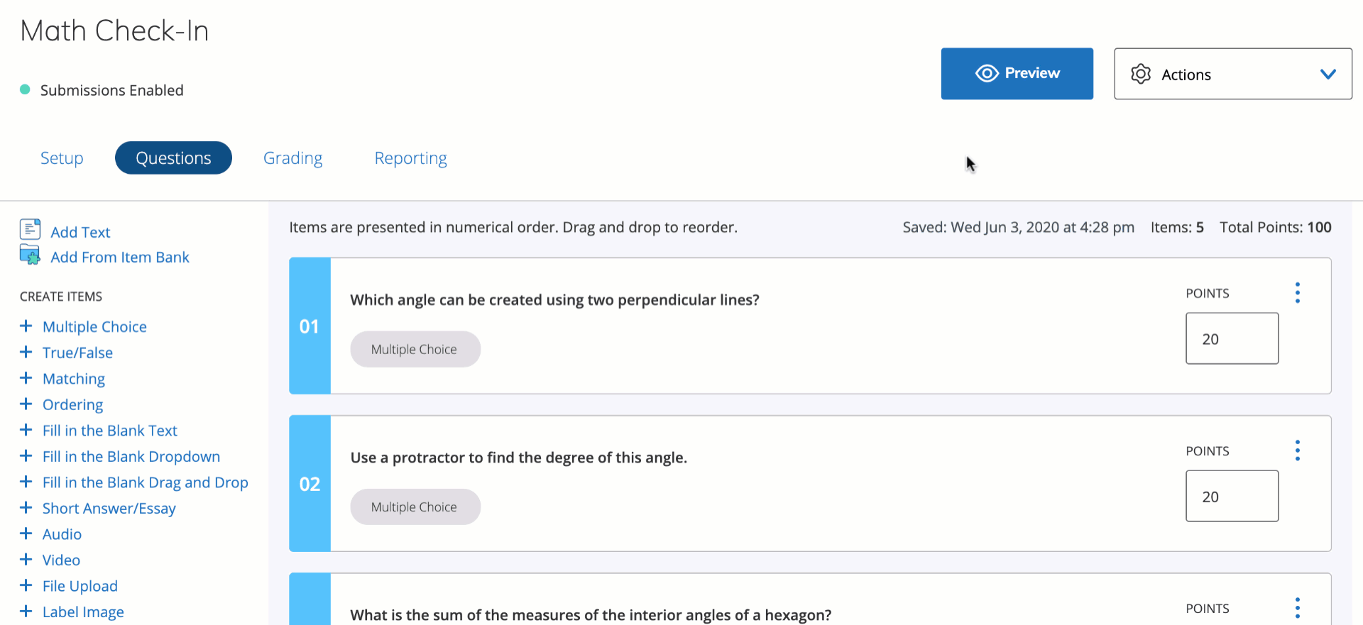 - Click Actions on the upper right of the assessment.
