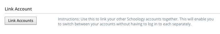 If you have another Parent account in Schoology, you can link your accounts to toggle between children from the down-facing arrow on the top right of Schoology. By keeping both accounts, and linking them together, you can access all content from a single login. The feature allows each school to manage your parent account settings appropriately, and to communicate with you seamlessly.