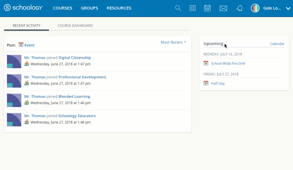 Set the default home page for your account to display Recent Activity or the Course Dashboard.