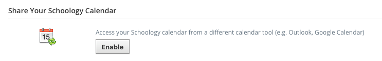 You can access your Schoology calendar information from a different calendar program by enabling this option in your Account Settings. Once enabled, Schoology provides an iCal link that enables you to share your Schoology Calendar with the calendar tool of your choice. Below are instructions for sharing your calendar: