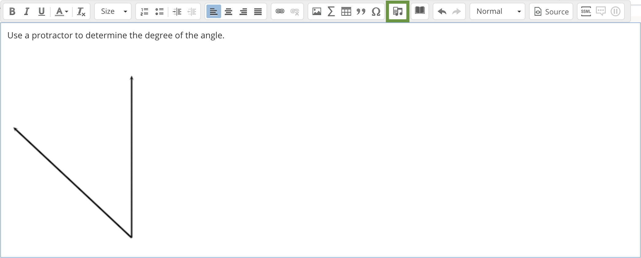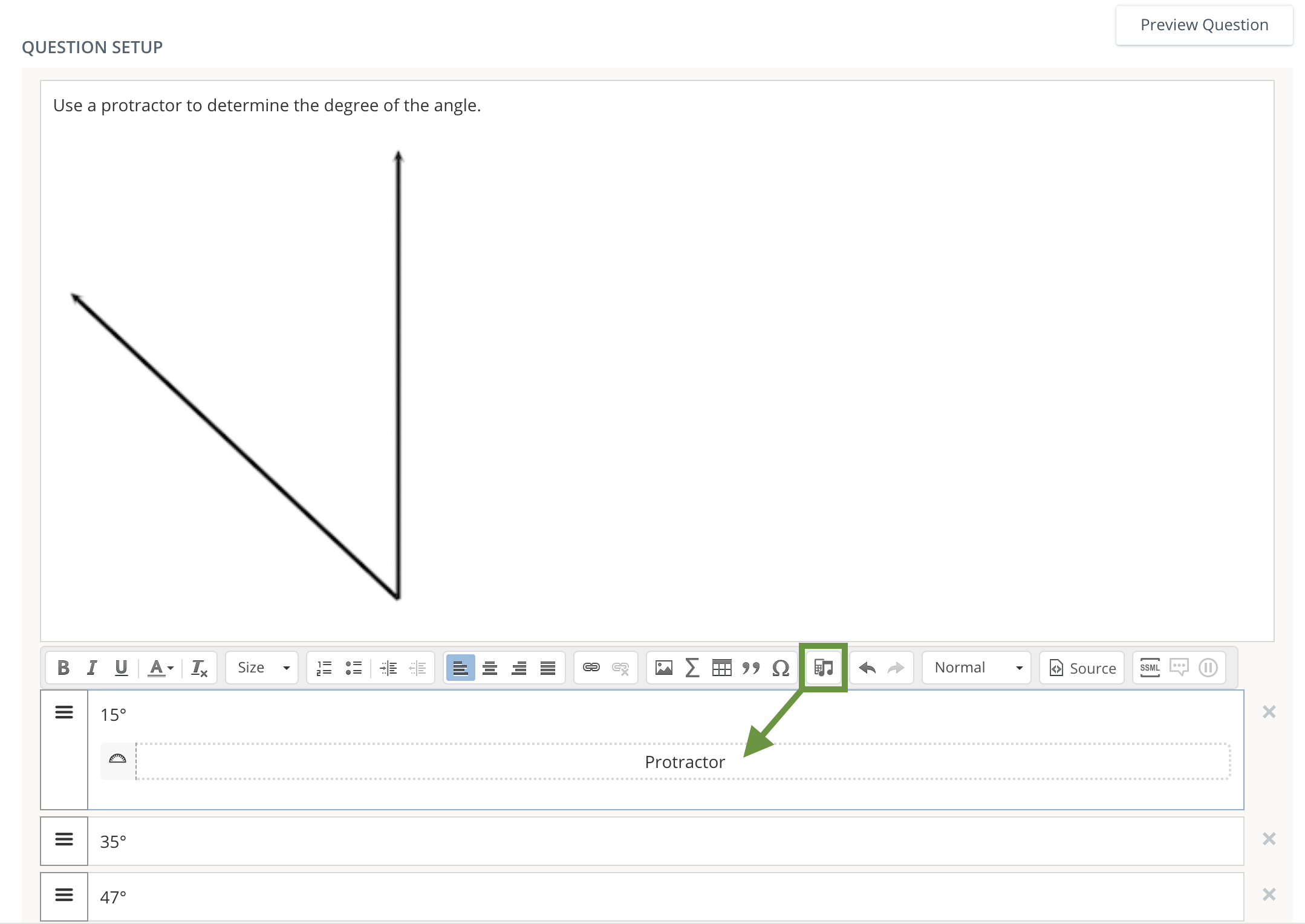Instructors may add tools to individual assessment questions to allow students to use while taking the assessment. To make a tool — such as a protractor, calculator, or ruler — available to students for an entire assessment, use the Assessment Tools in the assessment settings.