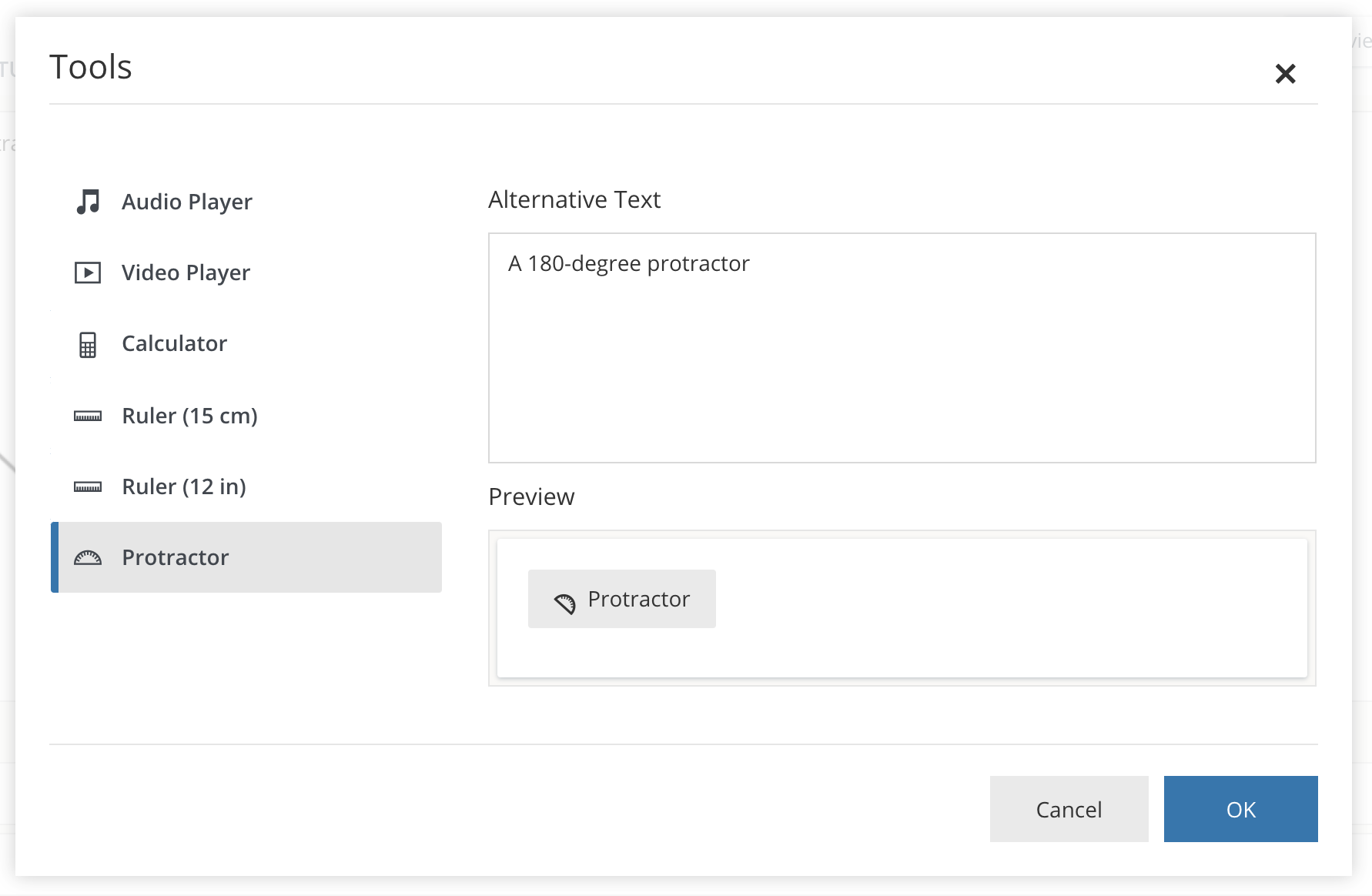 Step 2 — Select the calculator, protractor, or ruler from the list. You may edit the alternative text for each tool.