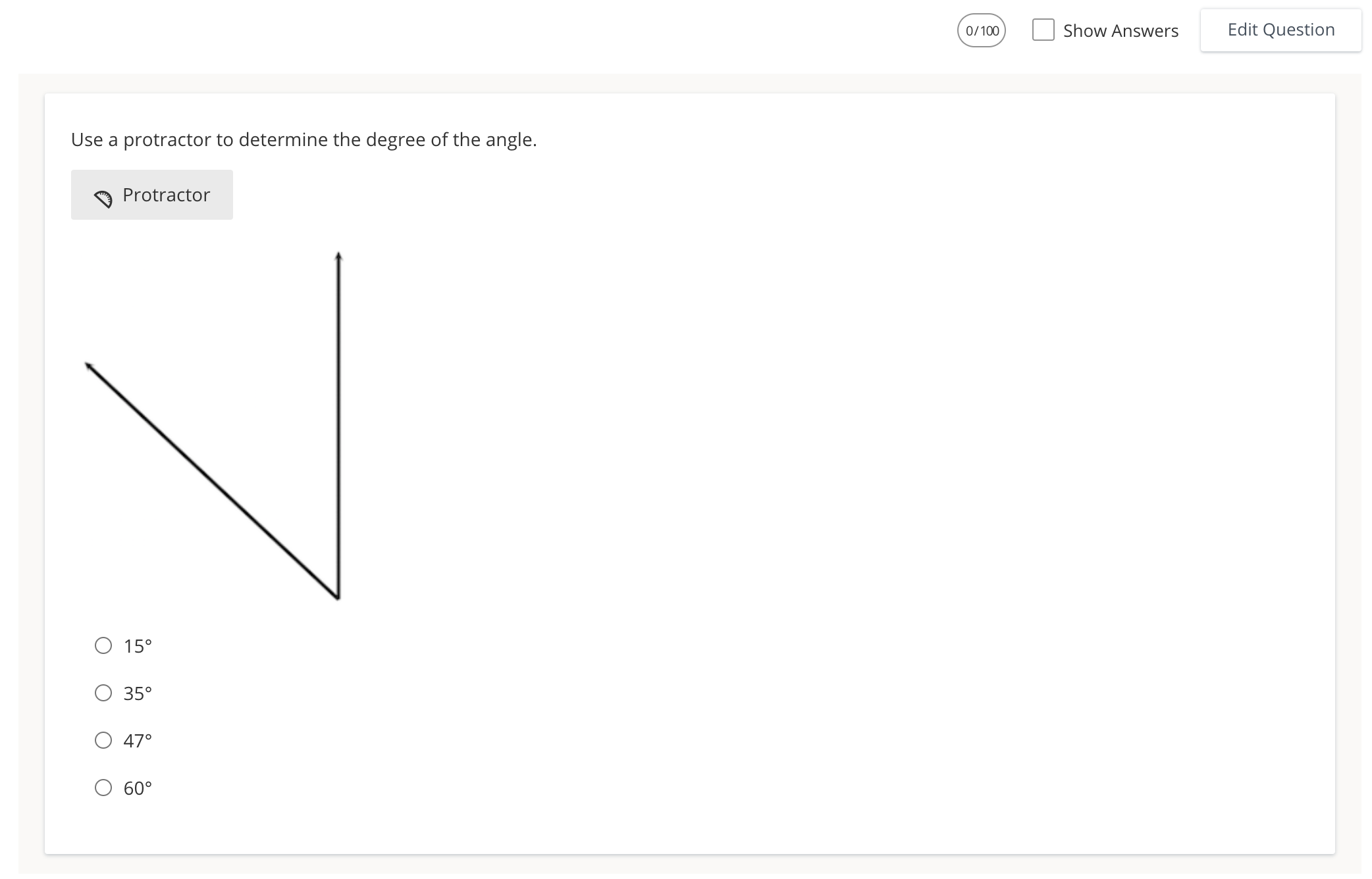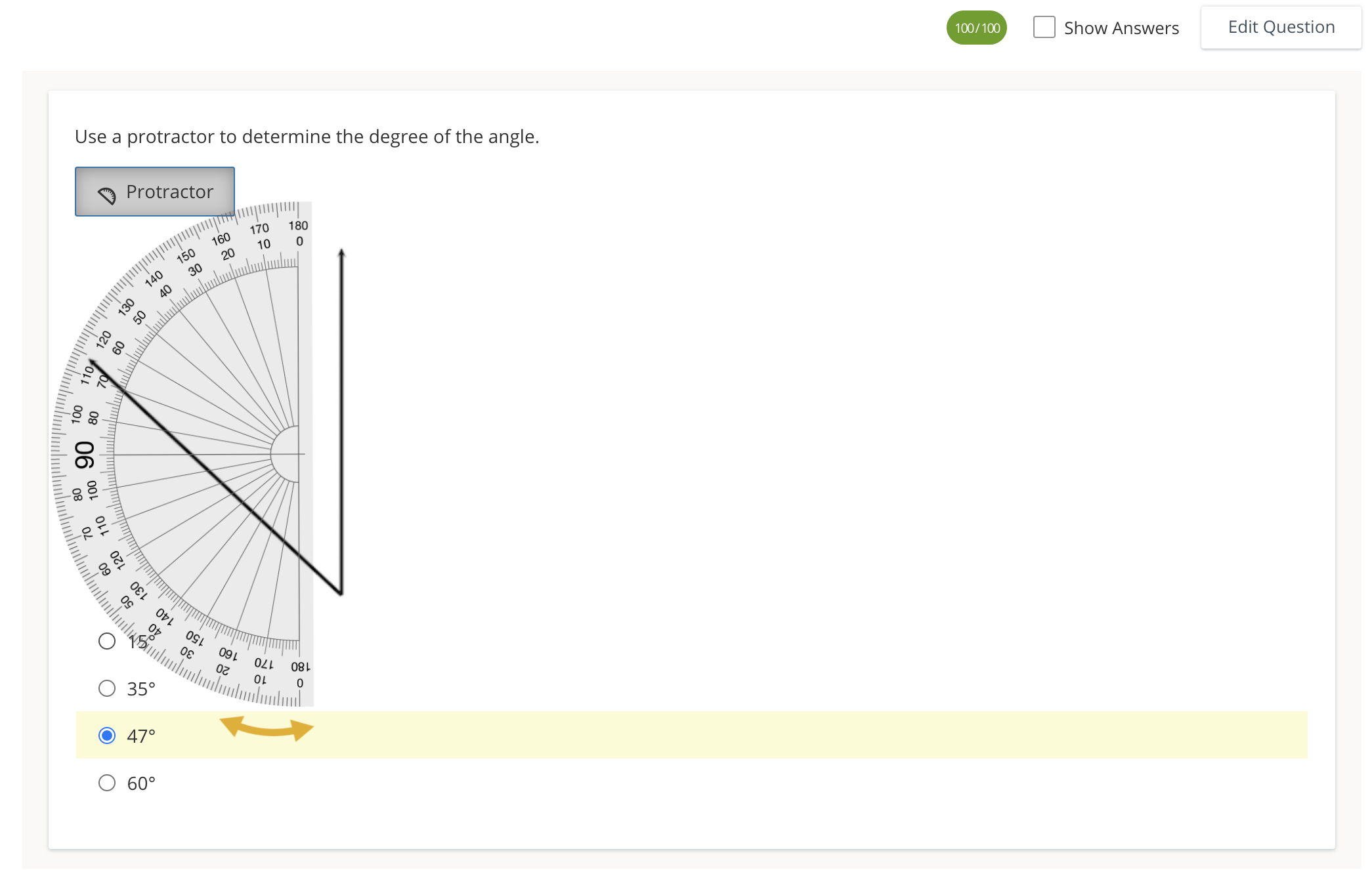 Step 5 — Click Protractor to expose the tool and find the correct answer.