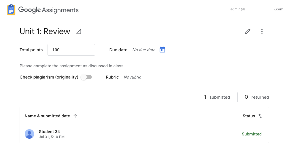 The instructor’s view for Google assignments displays the assignment settings and submissions.