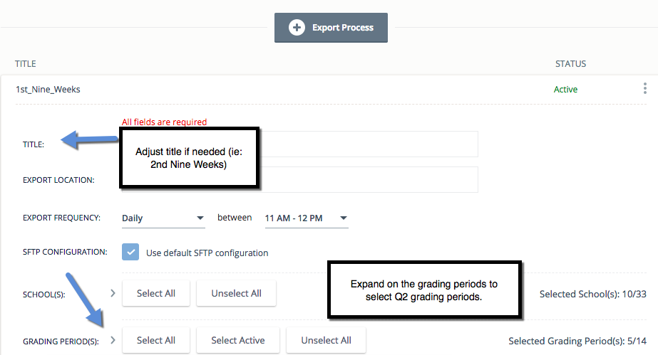 Review the auto export job at the start of a new grading period to make necessary adjustments (review Title, Export Frequency, selected Schools, selected Grading Periods) and click Save.