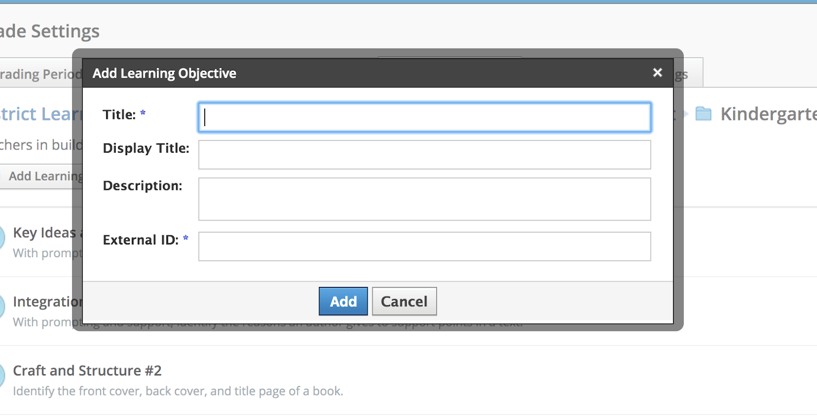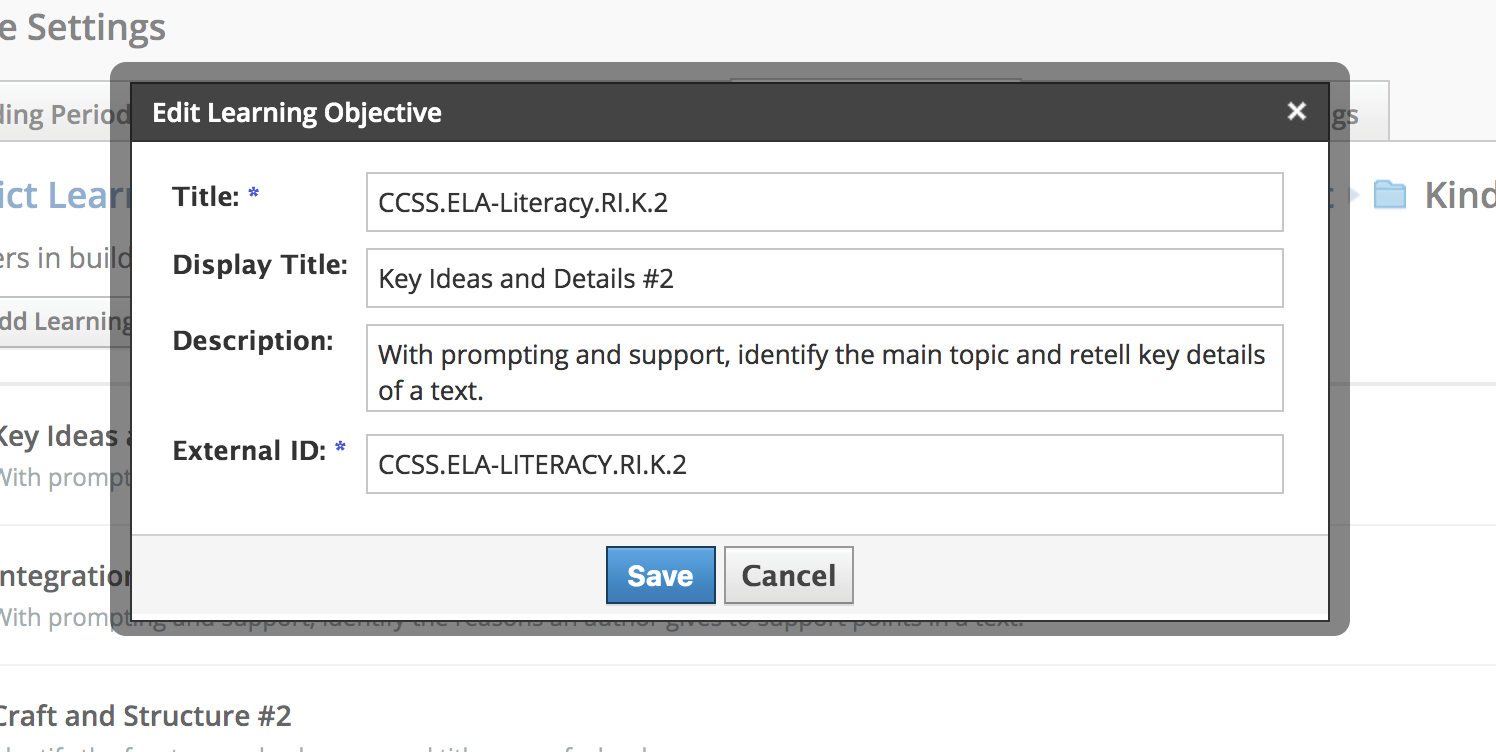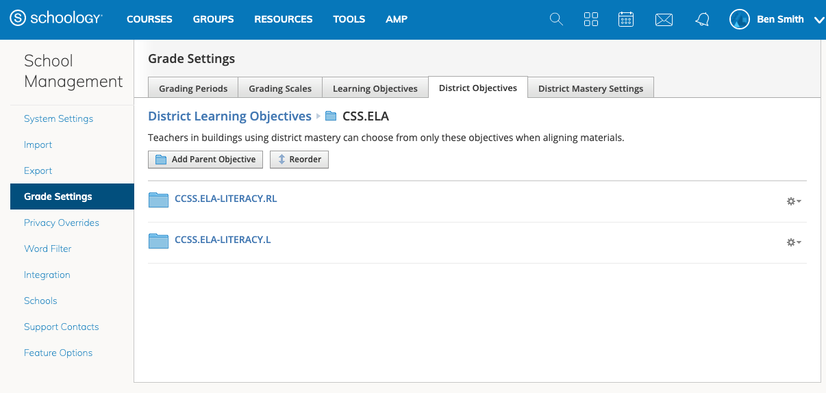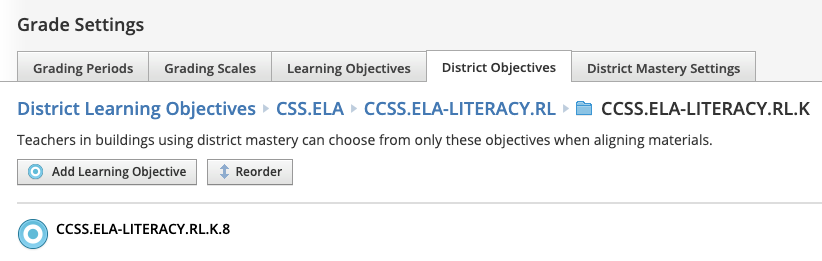 Como administrador del sistema, puede ver los objetivos de su distrito navegando a Herramientas > Administración del centro educativo > Configuración de calificaciones. Seleccione la pestaña Objetivos del distrito para ver todos los objetivos principales y los objetivos de aprendizaje que creó durante la importación: