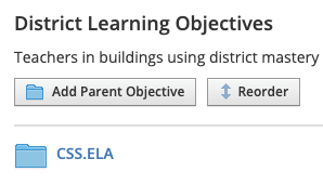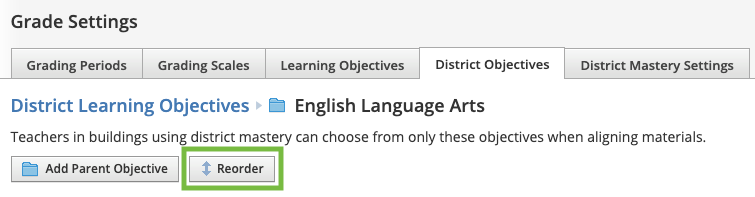 Puede reordenar los objetivos principales y los objetivos de aprendizaje para cambiar el orden en e que se muestran en la biblioteca. El orden de visualización en la Biblioteca de objetivos del distrito es el mismo orden que los instructores verán en el nivel del curso al seleccionar los objetivos de aprendizaje para alinearlos con los materiales del curso. Solo puede reordenar el orden de visualización dentro de cada nivel, es decir, no es posible reordenar la jerarquía de desempeño del distrito o mover objetivos de un nivel a otro.