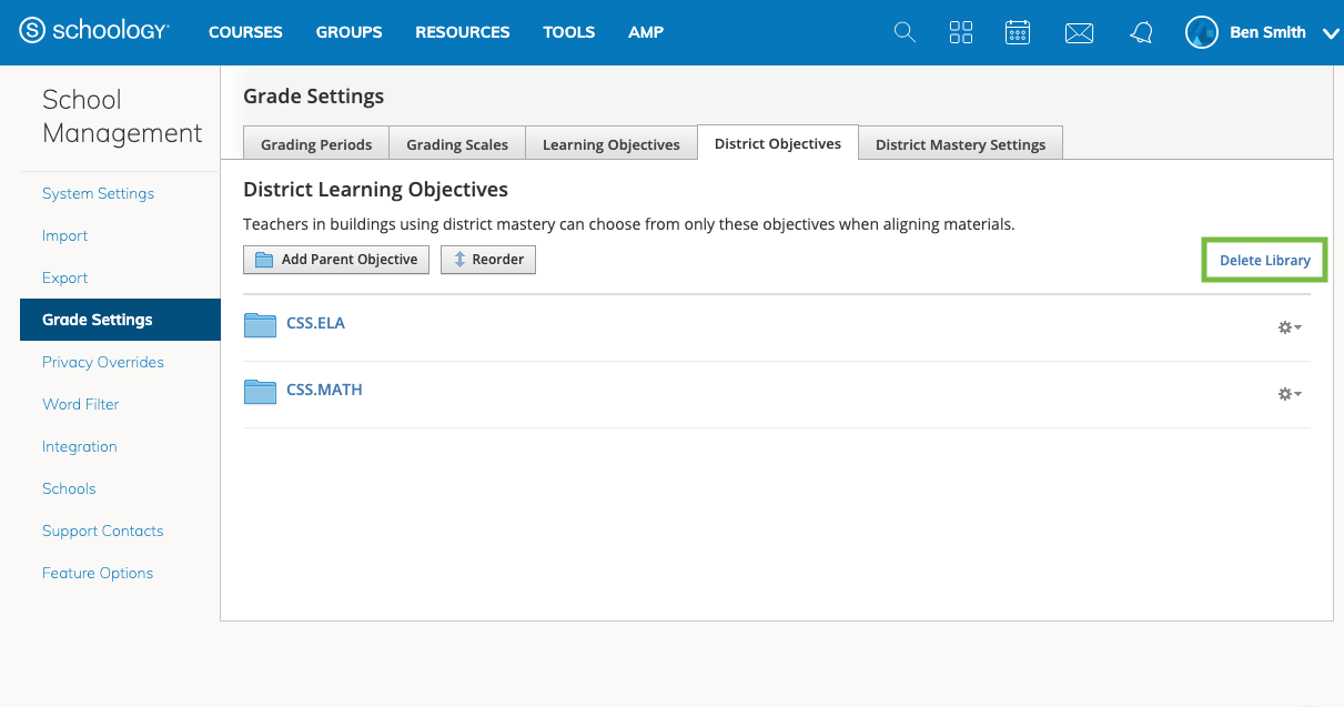 Sí, puede eliminar la biblioteca de objetivos del distrito y volver a importar una biblioteca nueva o actualizada, si es necesario. Puede elegir esta opción en casos en los que la importación inicial de la biblioteca fue incorrecta (debido a una jerarquía incongruente de objetivos de aprendizaje) y se necesita una importación nueva.