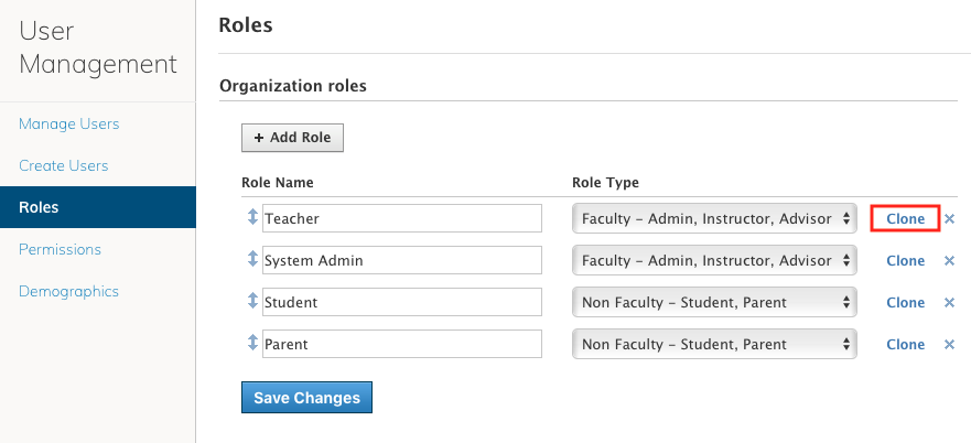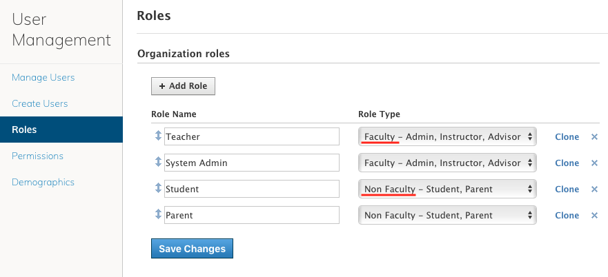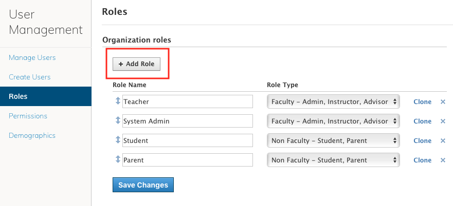 Los roles categorizan el tipo de cuenta para cada usuario del sistema. Existen cuatro (4) roles básicos predeterminados en su organización: alumno, docente, administrador y padre. Como administrador del sistema, puede crear roles nuevos en cualquier momento.