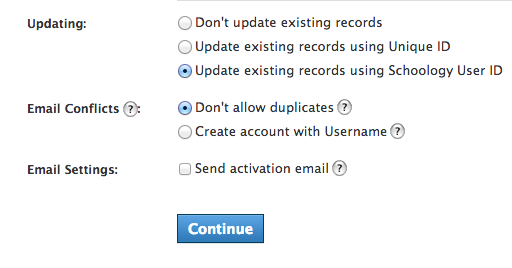 También puede elegir actualizar los registros existentes de los usuarios (al asociar el ID único de los usuarios). Podrá enviar un mensaje de correo electrónico de activación a los usuarios al realizar la importación. Nota: No utilice esta opción si sus usuarios inician sesión a través del LDAP o el SSO.