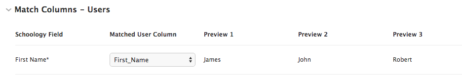 Luego de importar su archivo, tendrá la oportunidad de combinar las columnas en su archivo con aquellas en Schoology. Finalmente, tendrá una vista previa de la asociación de datos. Asegúrese de revisar este proceso atentamente antes de confirmar la carga.