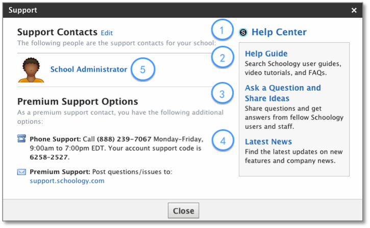 Teléfono: Los contactos de soporte pueden comunicarse con un representante de Schoology mediante un código de soporte enunciado en el botón Centro de ayuda (visible únicamente para los contactos de soporte).