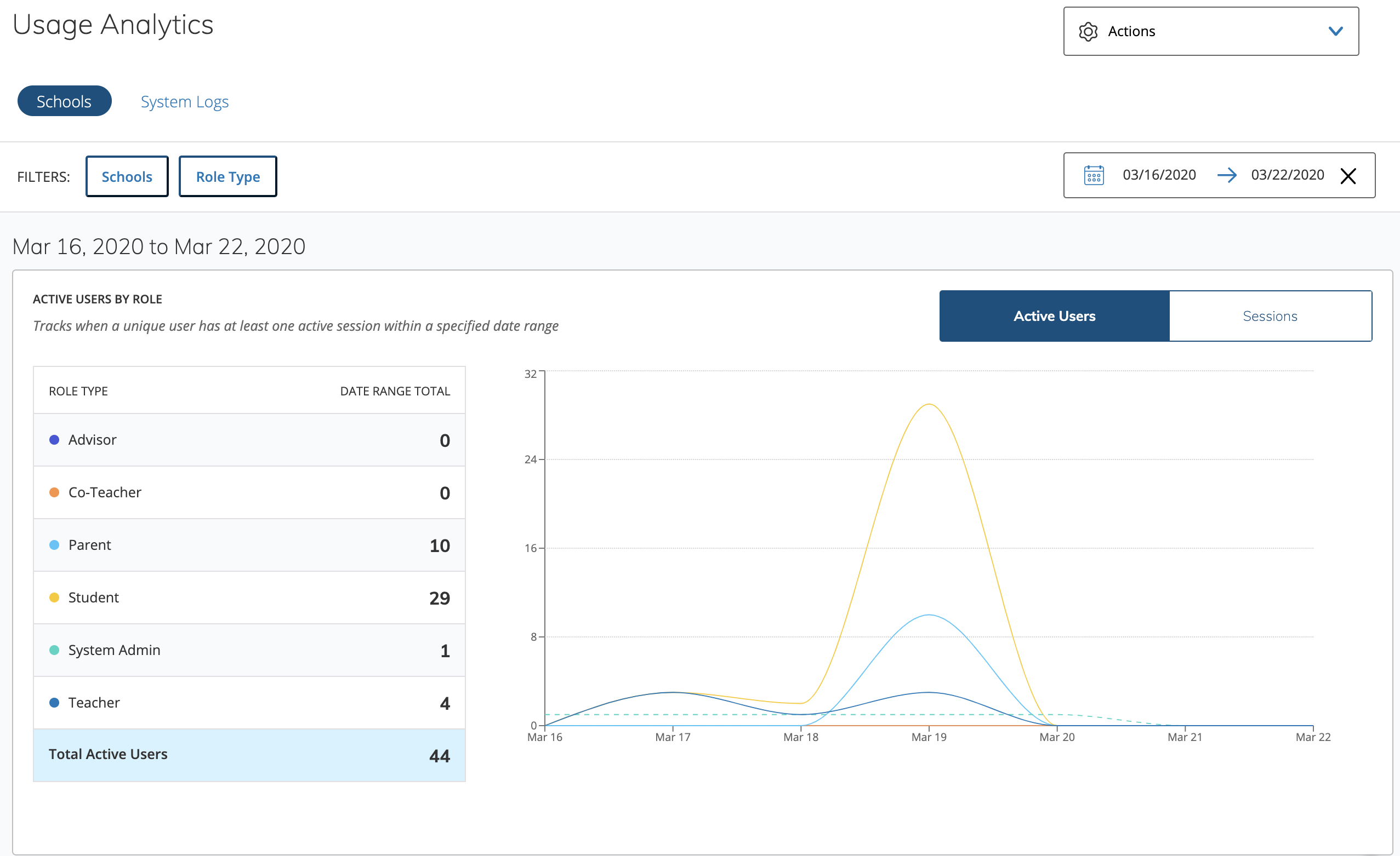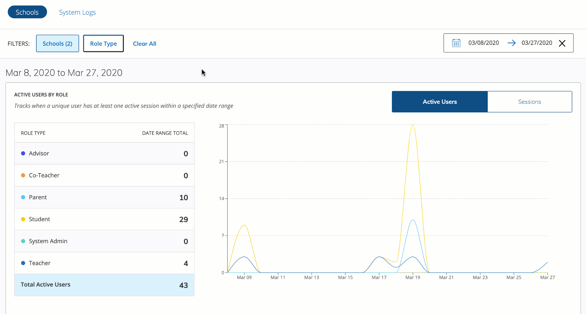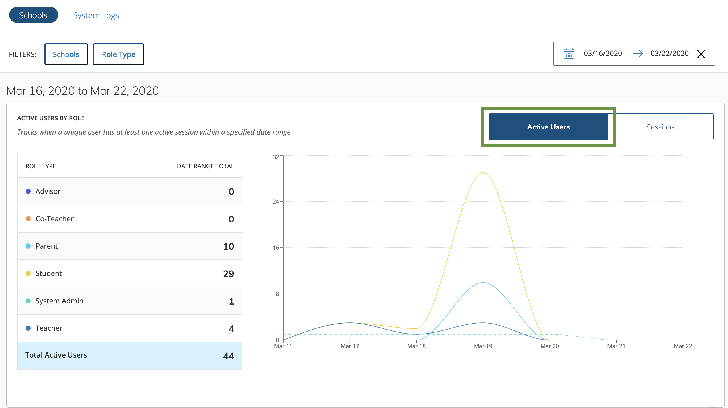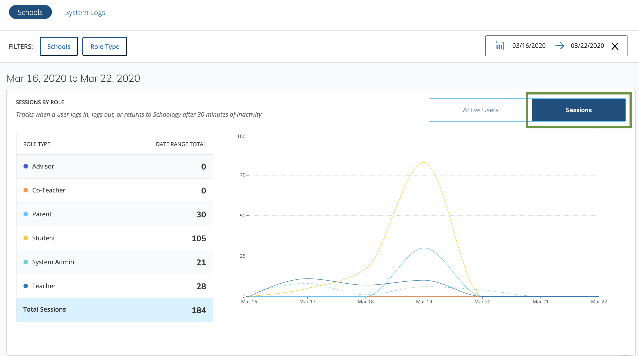 Seleccione Sesiones en el gráfico de uso para ver la cantidad de inicios y cierres de sesión de los usuarios y la cantidad de veces que regresaron a Schoology luego de 30 minutos de inactividad.