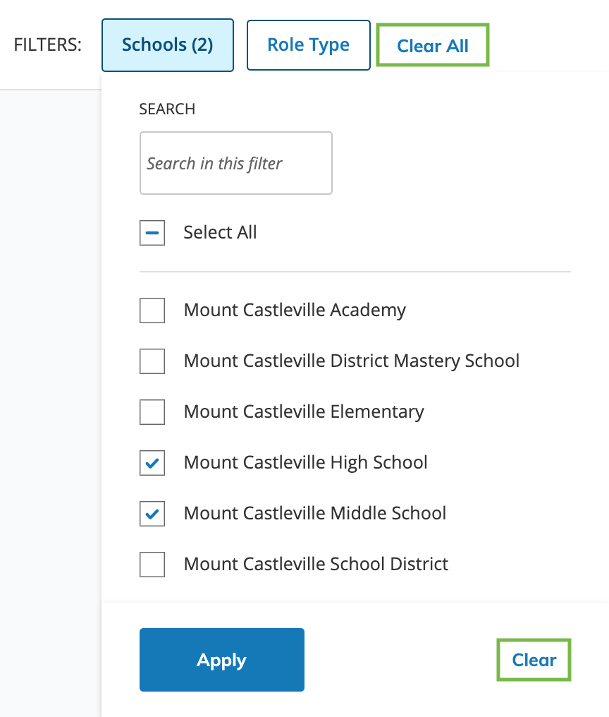 Haga clic en Eliminar todos para actualizar la búsqueda y seleccionar campus escolares o roles diferentes. También puede seleccionar Eliminar en el menú desplegable Centros educativos: