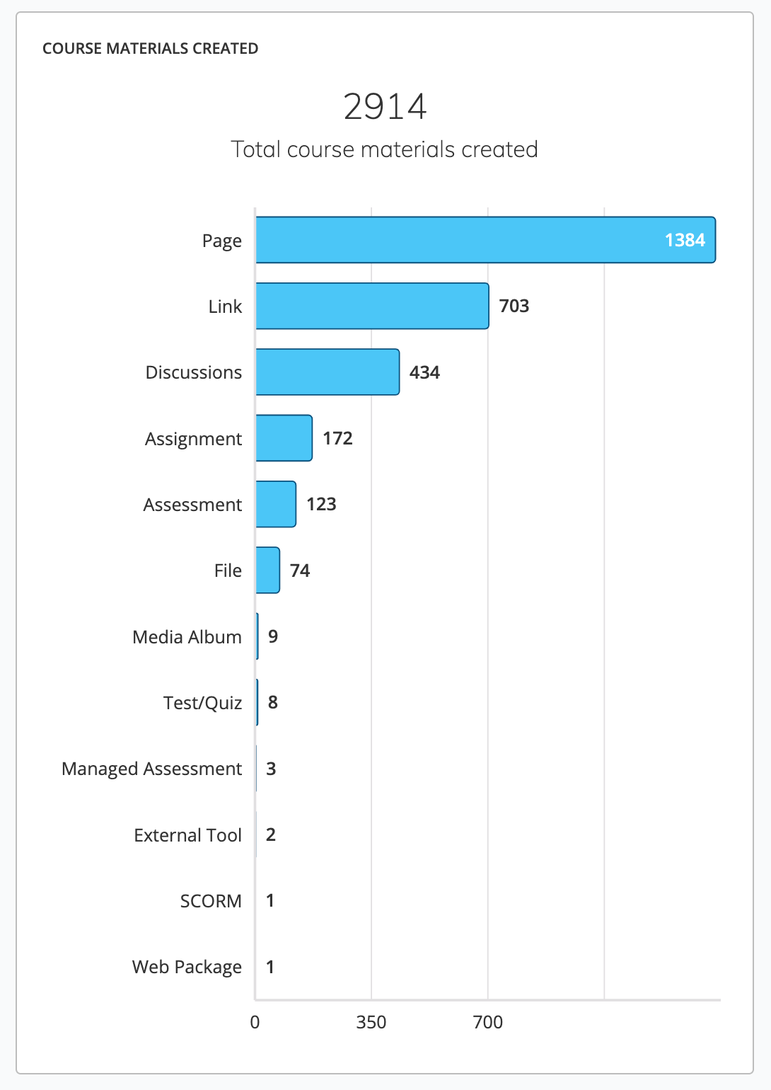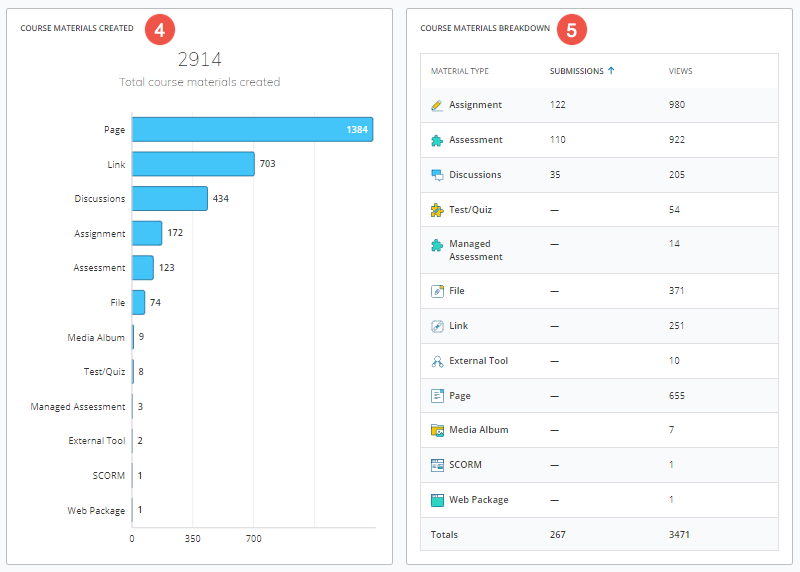 La tabla Materiales del curso creados muestra la cantidad de materiales del curso que se crearon en total. Se encuentra debajo de las tablas de uso y de uso según el rol.