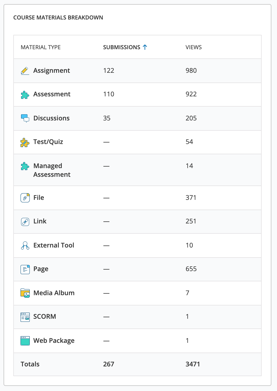 Desglose de materiales del curso: muestra las entregas y los datos de visualización de todos los materiales del curso.