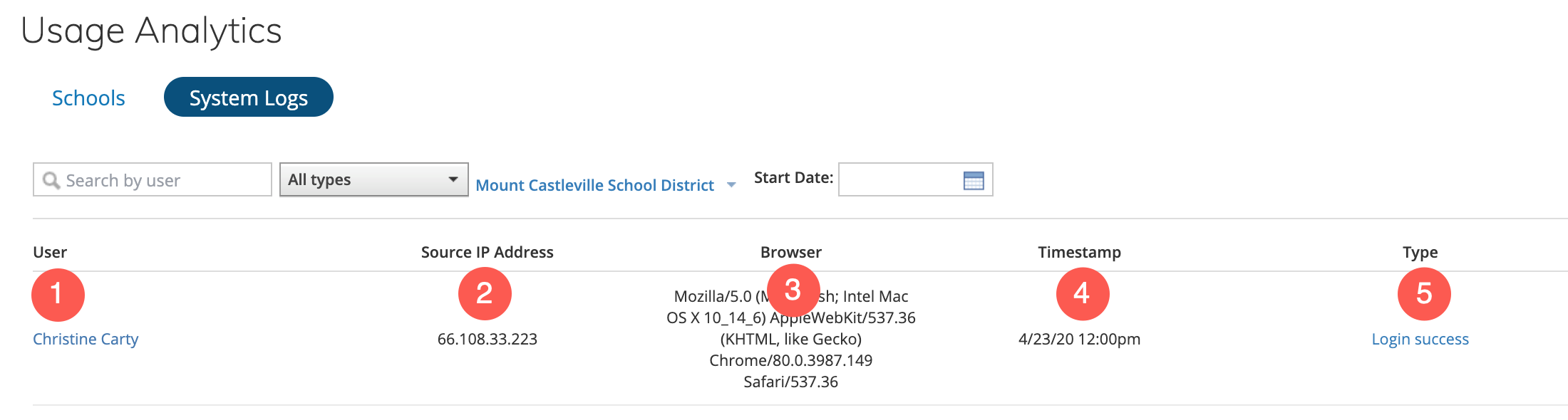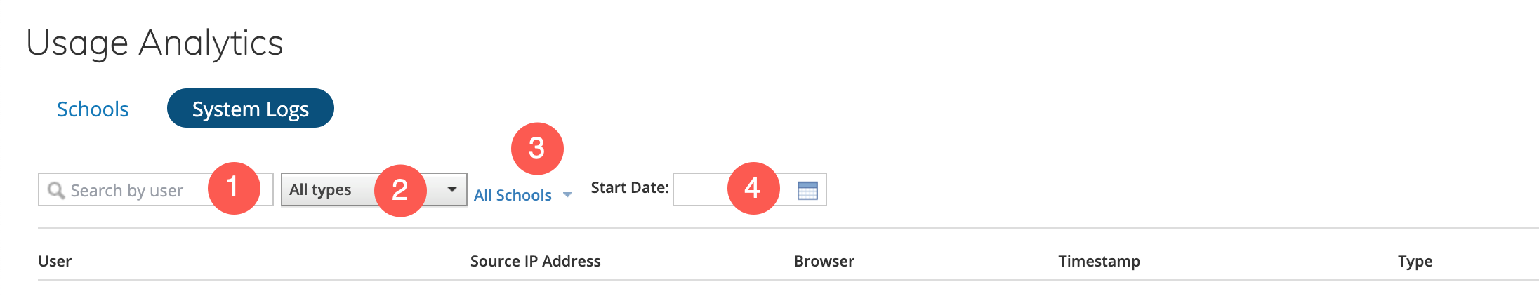 Ver por centro educativo: si su organización tiene más de un centro educativo, verá una opción para filtrar los registros del sistema por centro educativo. La vista predeterminada muestra todos los centros educativos. Puede filtrar los registros del sistema seleccionando un centro educativo en el menú desplegable.
