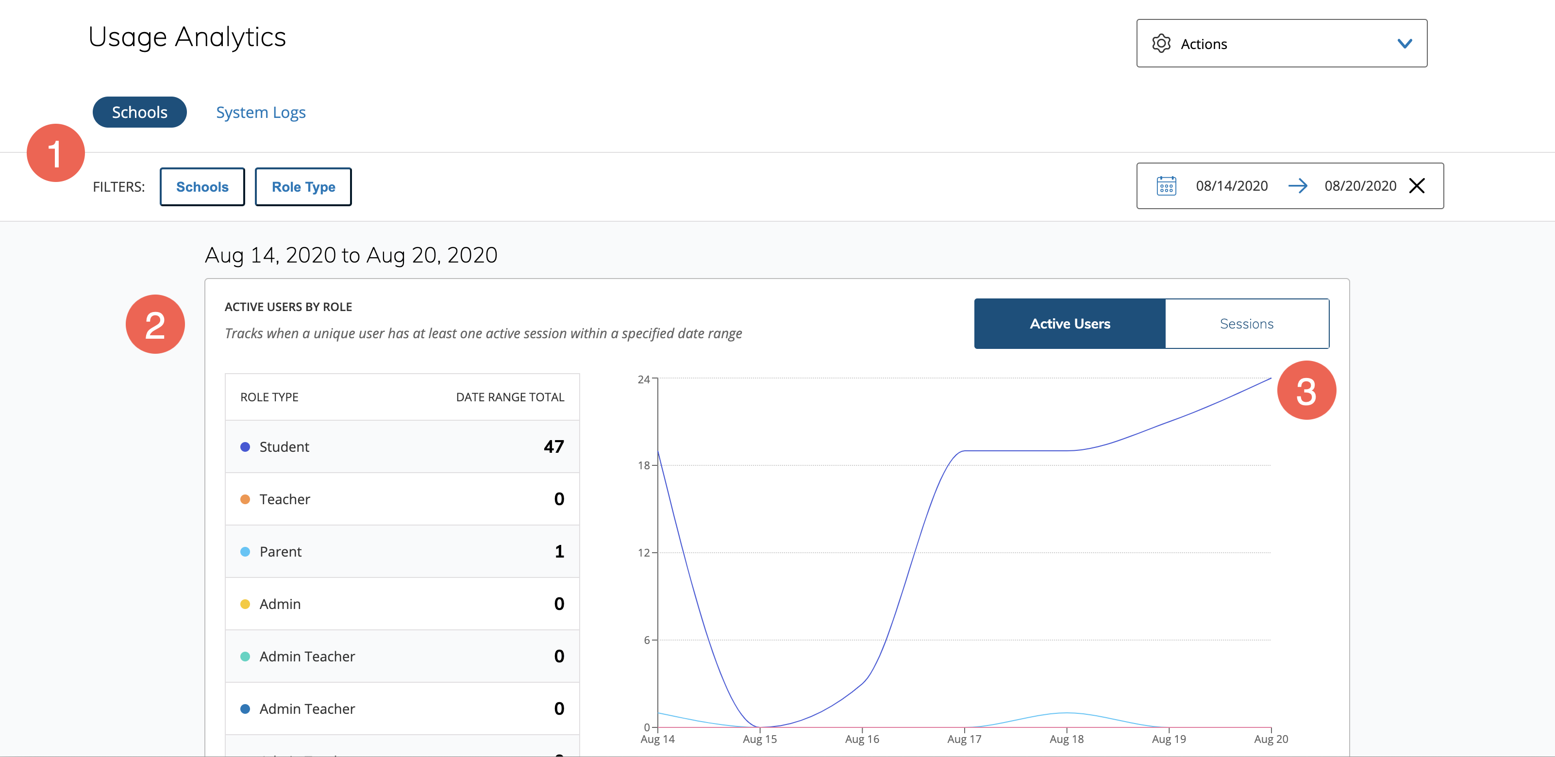 Nota: El filtro Tipo de rol y las áreas Usuarios activos y Sesiones no afectan el resultado de la tabla Materiales del curso creados. Solo puede usar los filtros Centros educativos e Intervalo de fechas.