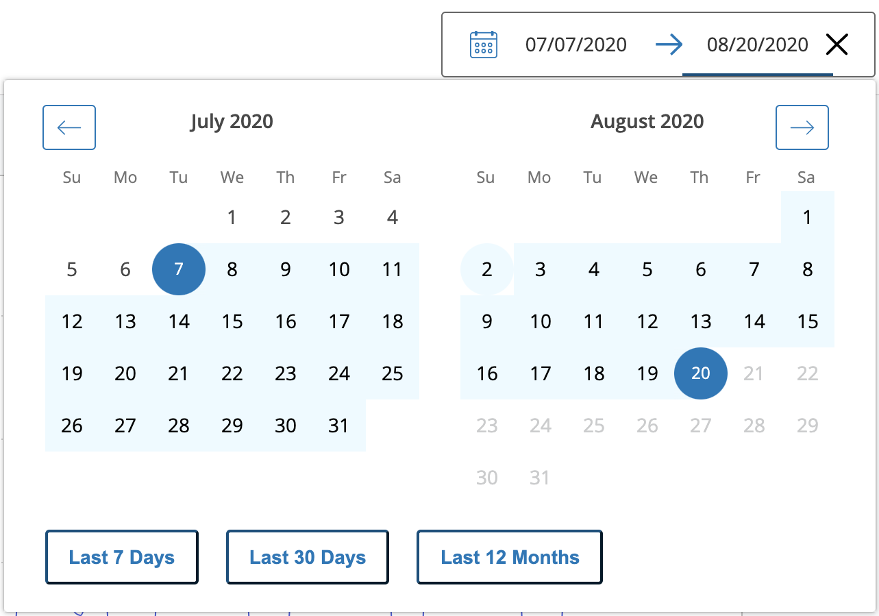 Rango de fechas: use el calendario para filtrar los datos de uso por rango de tiempo seleccionado. También puede seleccionar los filtros de rango de fechas preestablecidos: últimos 7 días, últimos 30 días y últimos 12 meses.