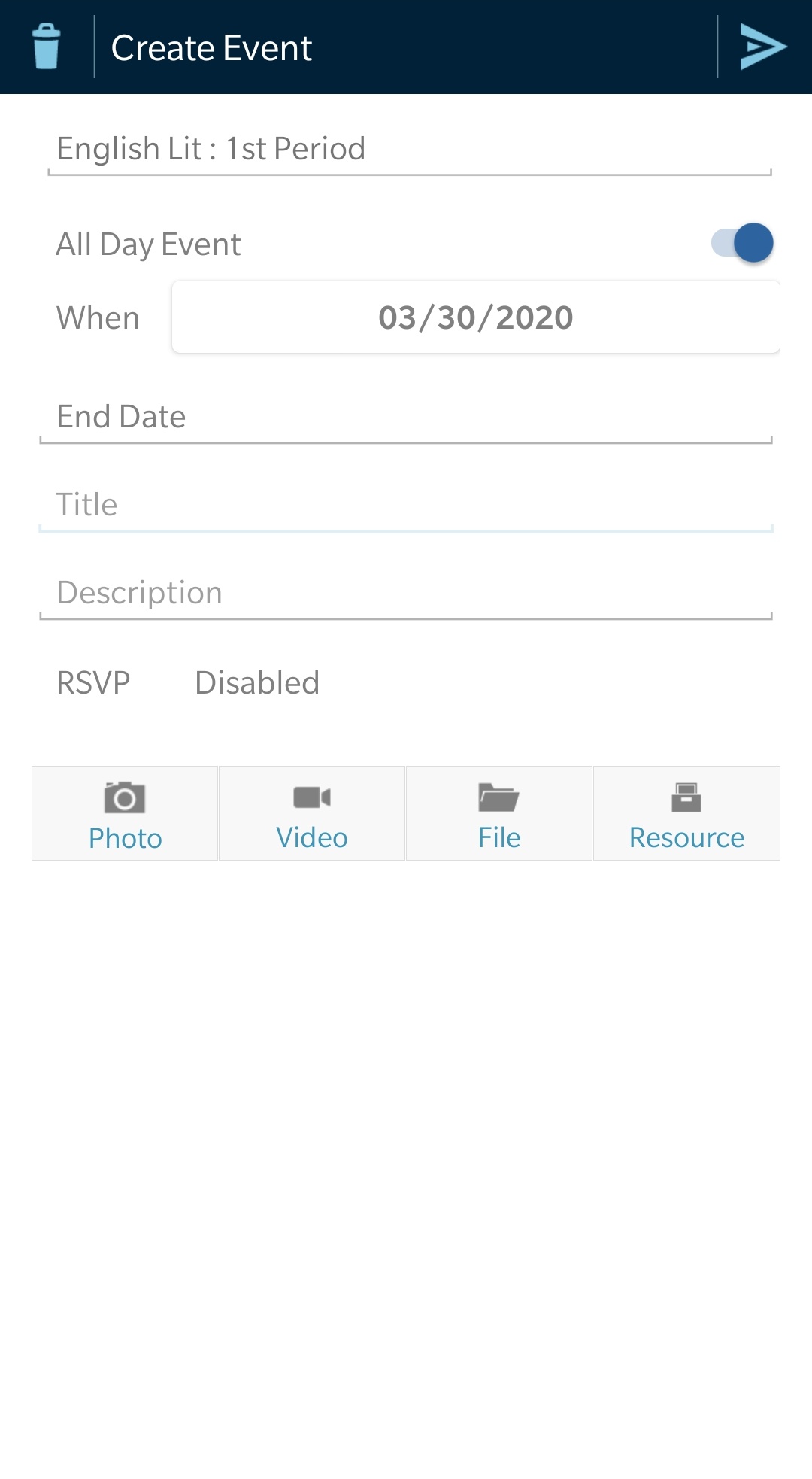 Si desea cancelar el evento, pulse el icono de papelera en la esquina superior izquierda o pulse Atrás en su dispositivo.