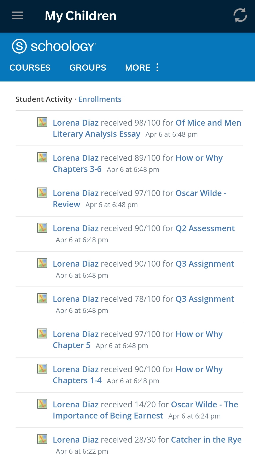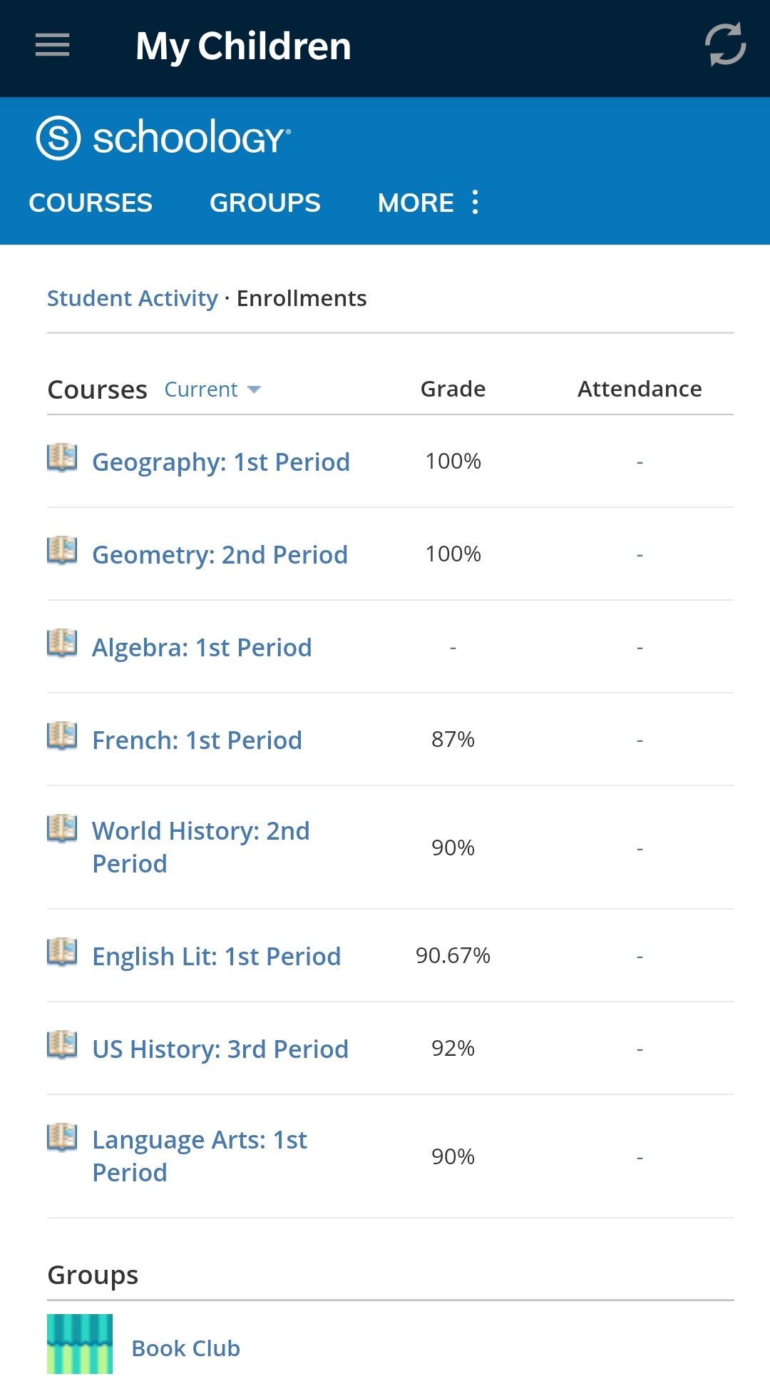 Mis hijos: vea la actividad de su hijo en Schoology (cursos, grupos, calendarios, calificaciones, asistencia, etc.).