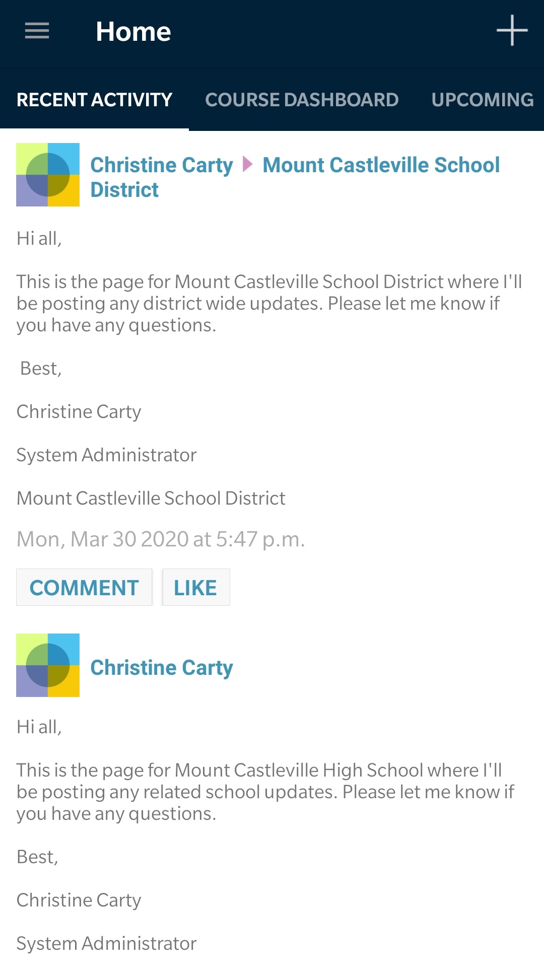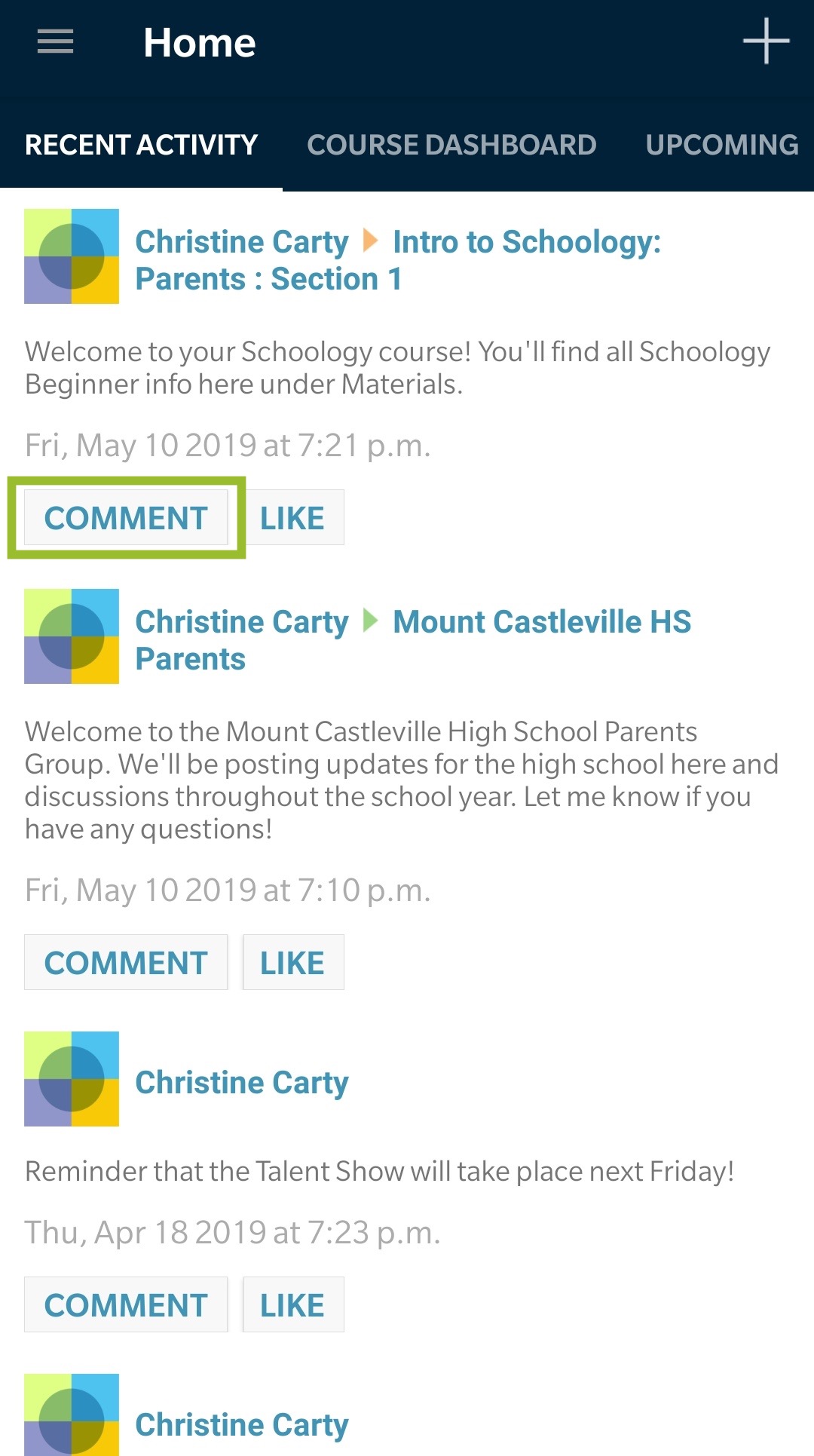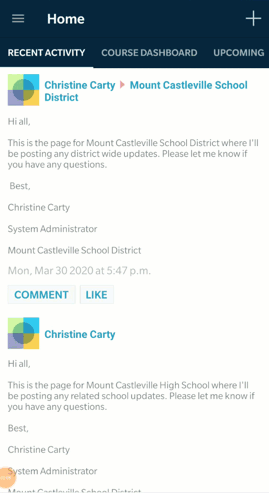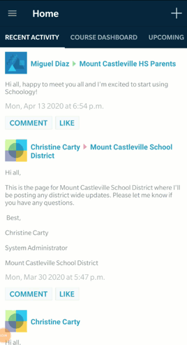 El áreaActividad recientemuestra todas las actualizaciones y las publicaciones de blog más recientes que aparecen automáticamente en la página de inicio de Schoology.