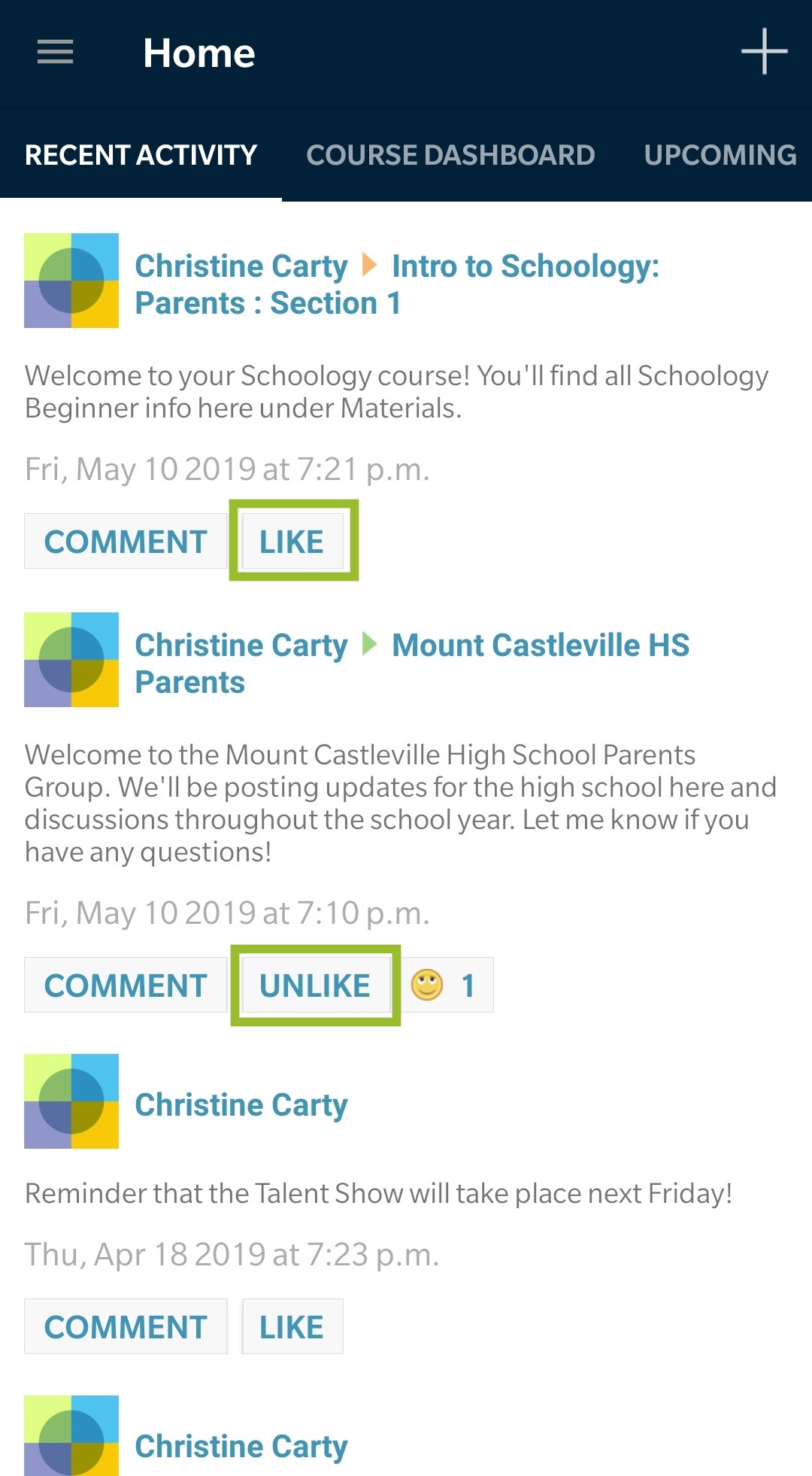 Para indicar que le gusta una actualización o un comentario, pulse Me gusta debajo de la actualización o el comentario. Si desea quitar el Me gusta, pulse Ya no me gusta.