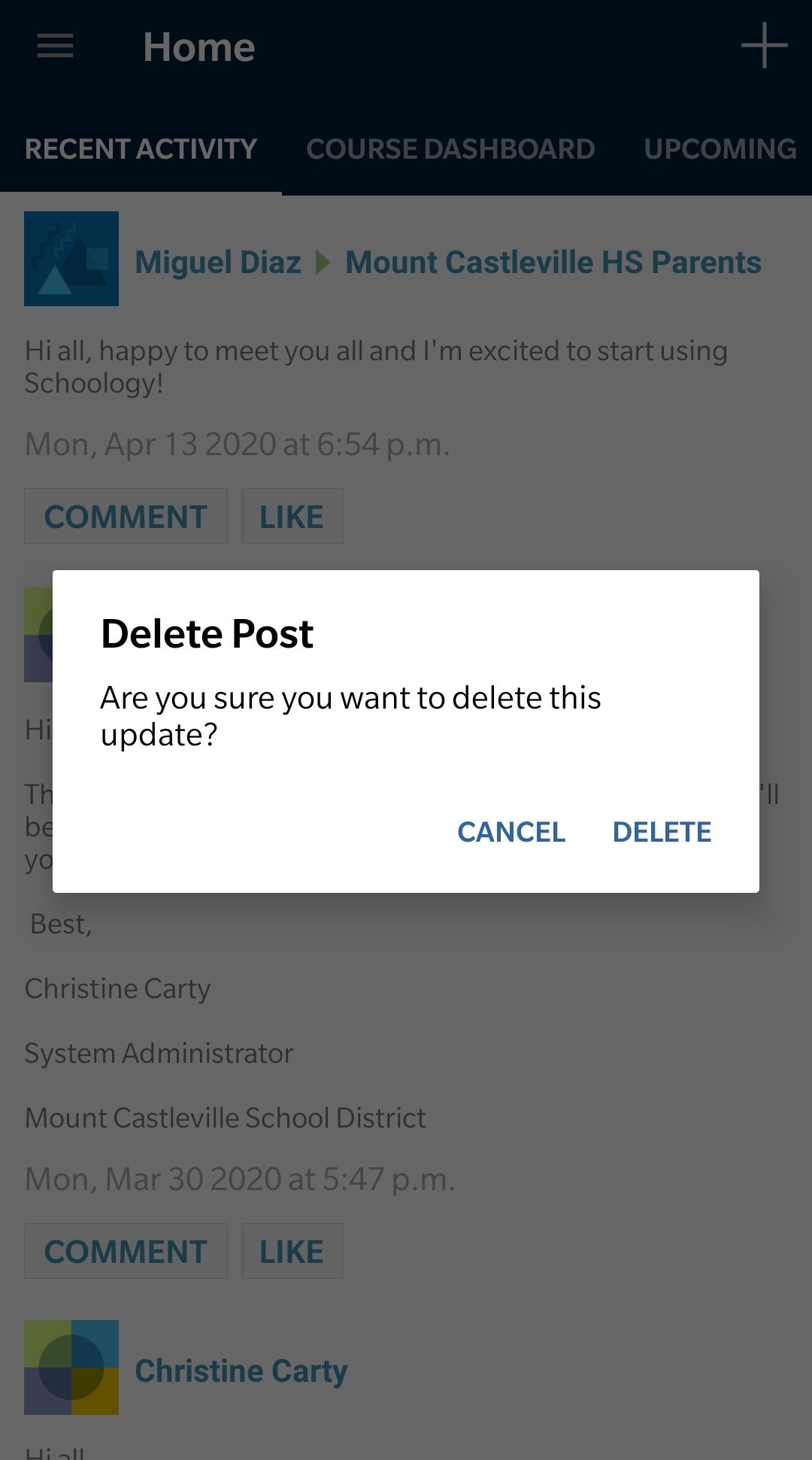 Para eliminar una actualización, pulse y mantenga pulsada la actualización. Aparecerá una ventana emergente donde deberá confirmar o cancelar la eliminación. Tenga en cuenta que solo puede eliminar una actualización que haya creado. Para crear una actualización, consulteCrear una actualización.