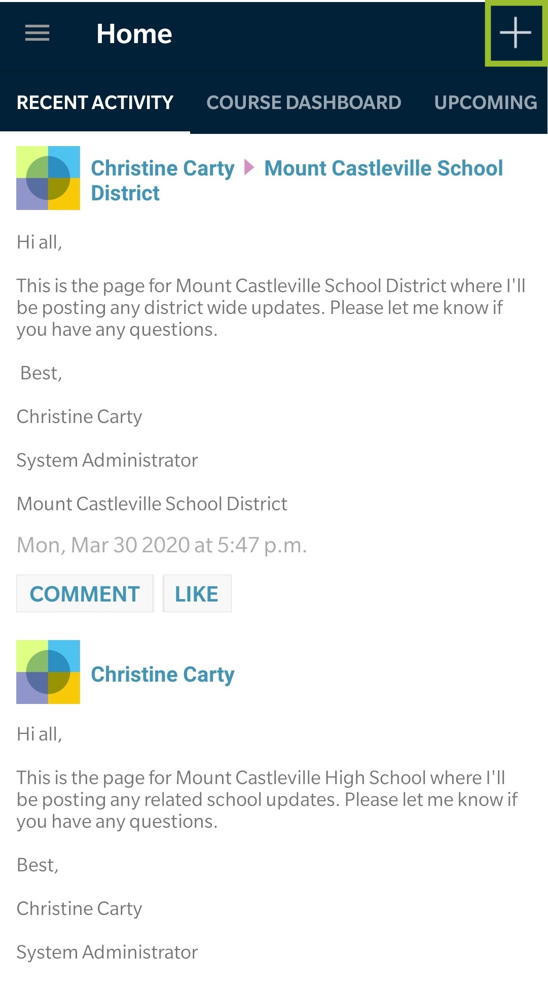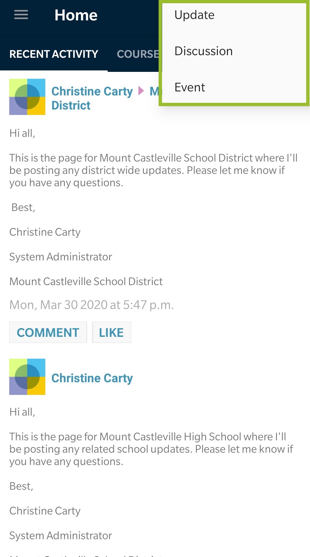 La herramienta de publicación rápida en la aplicación para Android de Schoology permite crear rápidamente actualizaciones, tareas, eventos y foros tanto desde la pantalla de inicio de Schoology como desde los cursos y grupos. Pulse el icono+en la esquina superior derecha de la vistaActividad reciente para ver estas opciones: